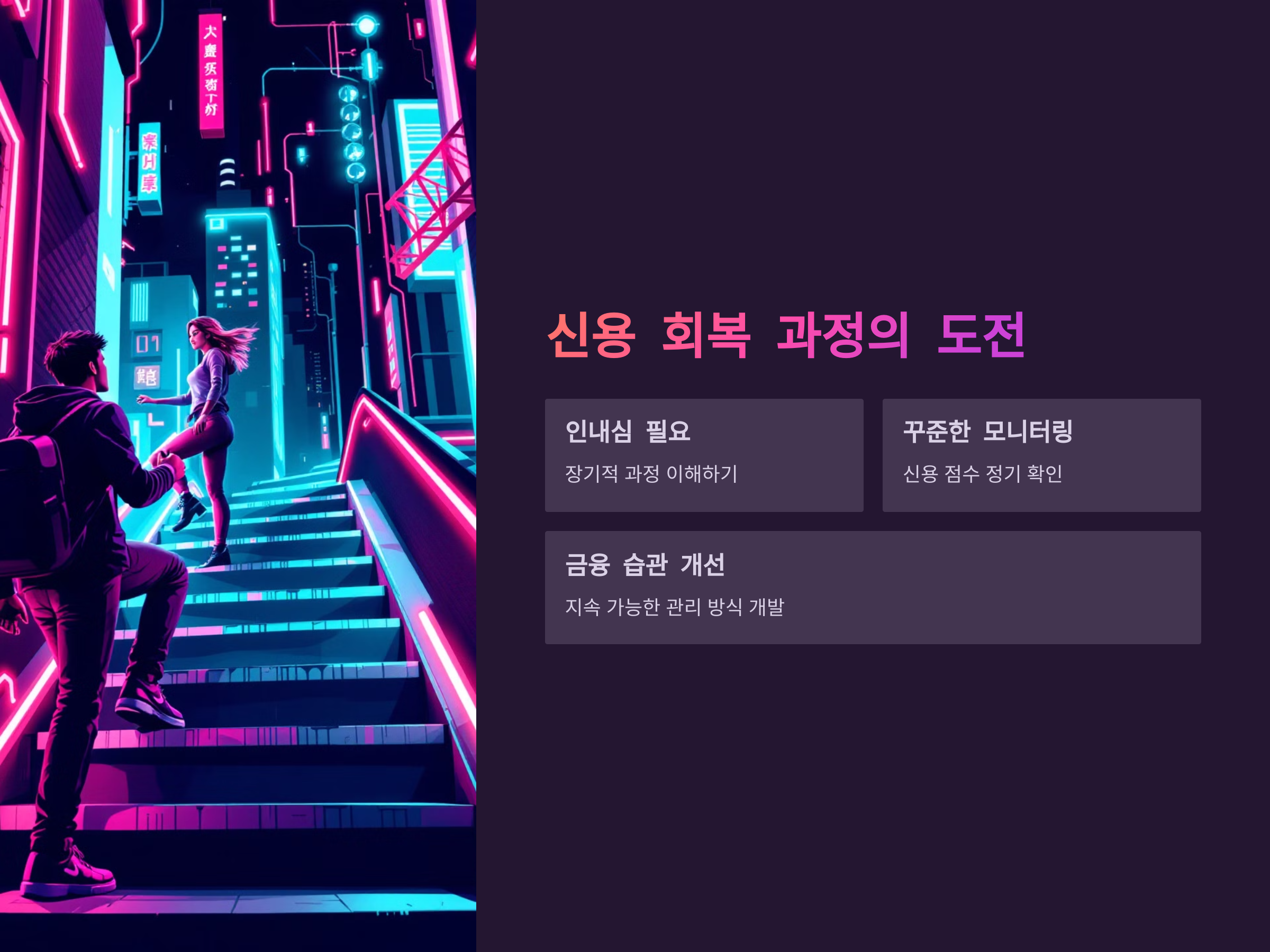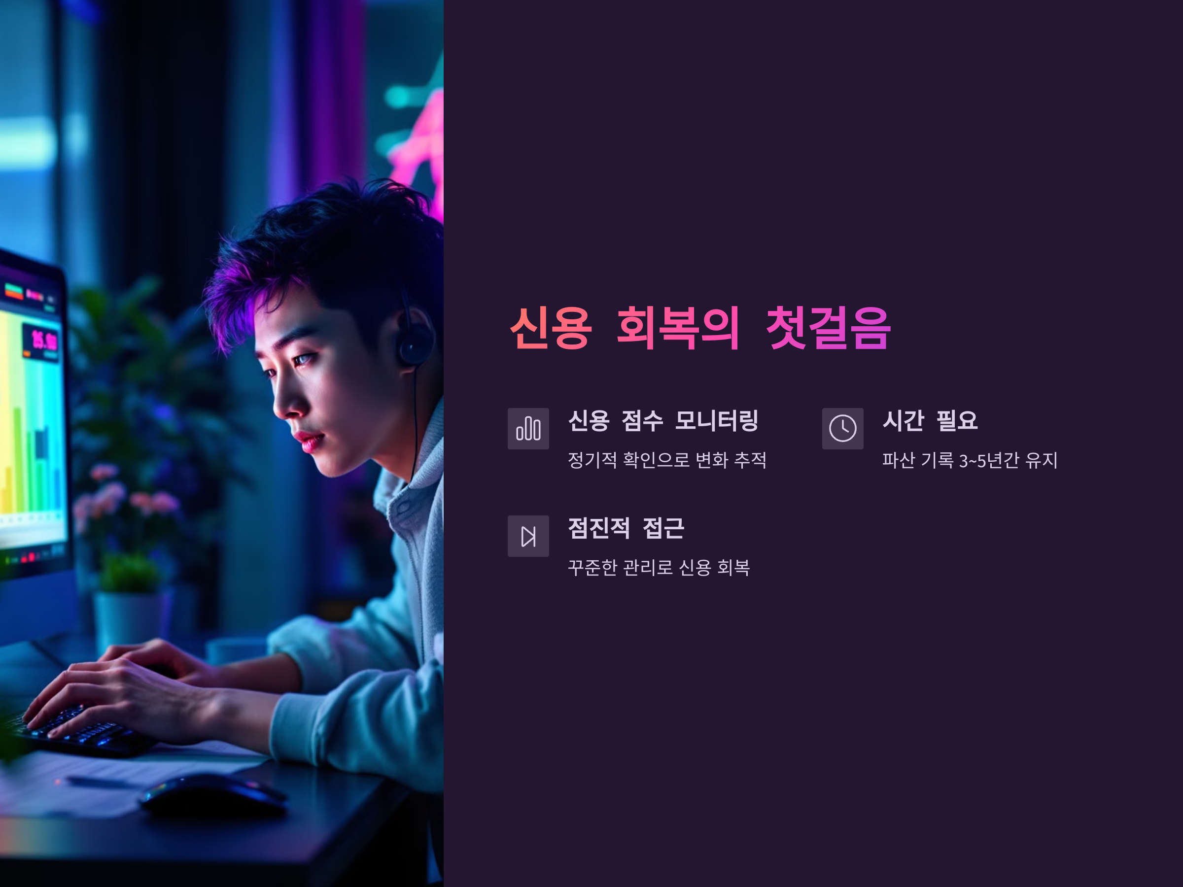 신용 회복에는 시간이 필요하지만, 그 과정에서 얻는 금융적 안정은 여러분의 미래를 보다 밝고 풍요롭게 만들 것입니다.