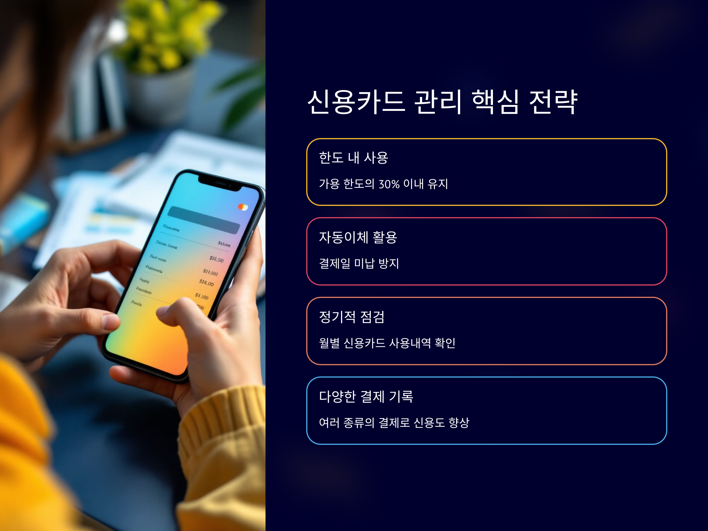 개인파산 후 신용카드를 발급받았다고 해서 무조건 신용이 회복되는 것은 아닙니다. 신용카드를 사용하면서 중요한 것은 사용 내역을 성실하게 관리하는 것입니다. 이를 통해 신용회복에 큰 도움이 될 수 있습니다. 신용카드를 사용하면서 매월 결제일에 맞춰 결제하는 것이 매우 중요하며, 불필요한 지출을 줄이고 사용을 신중하게 해야 합니다.