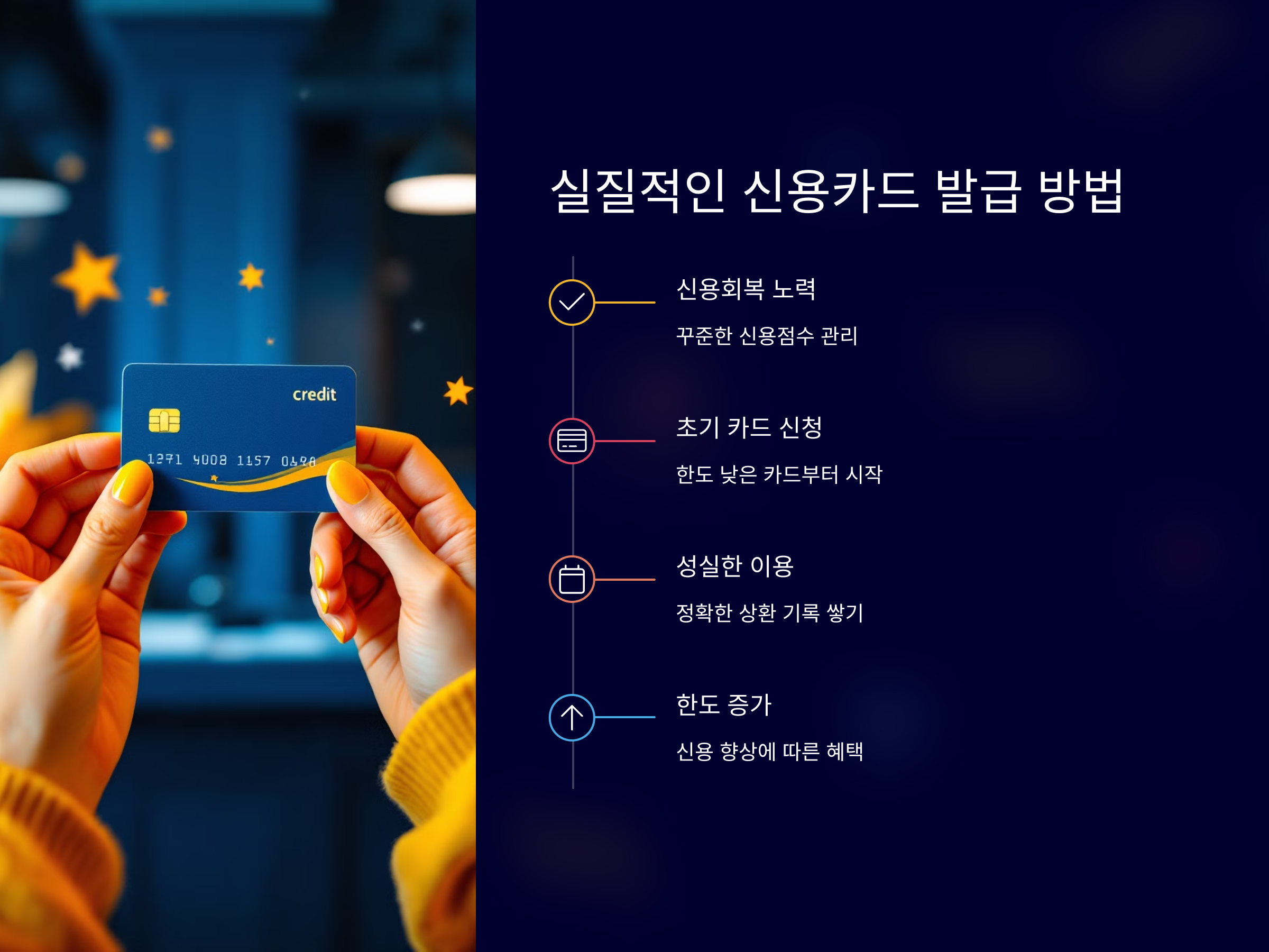 신용카드를 발급받은 후에도 일정 기간 동안 성실히 결제 기록을 쌓고, 카드 사용을 관리하는 것이 신용 회복을 위한 핵심 전략입니다. 신용카드를 잘 관리하면 점차적으로 신용점수가 상승하고, 더 나은 조건의 카드로 변경이 가능해집니다.