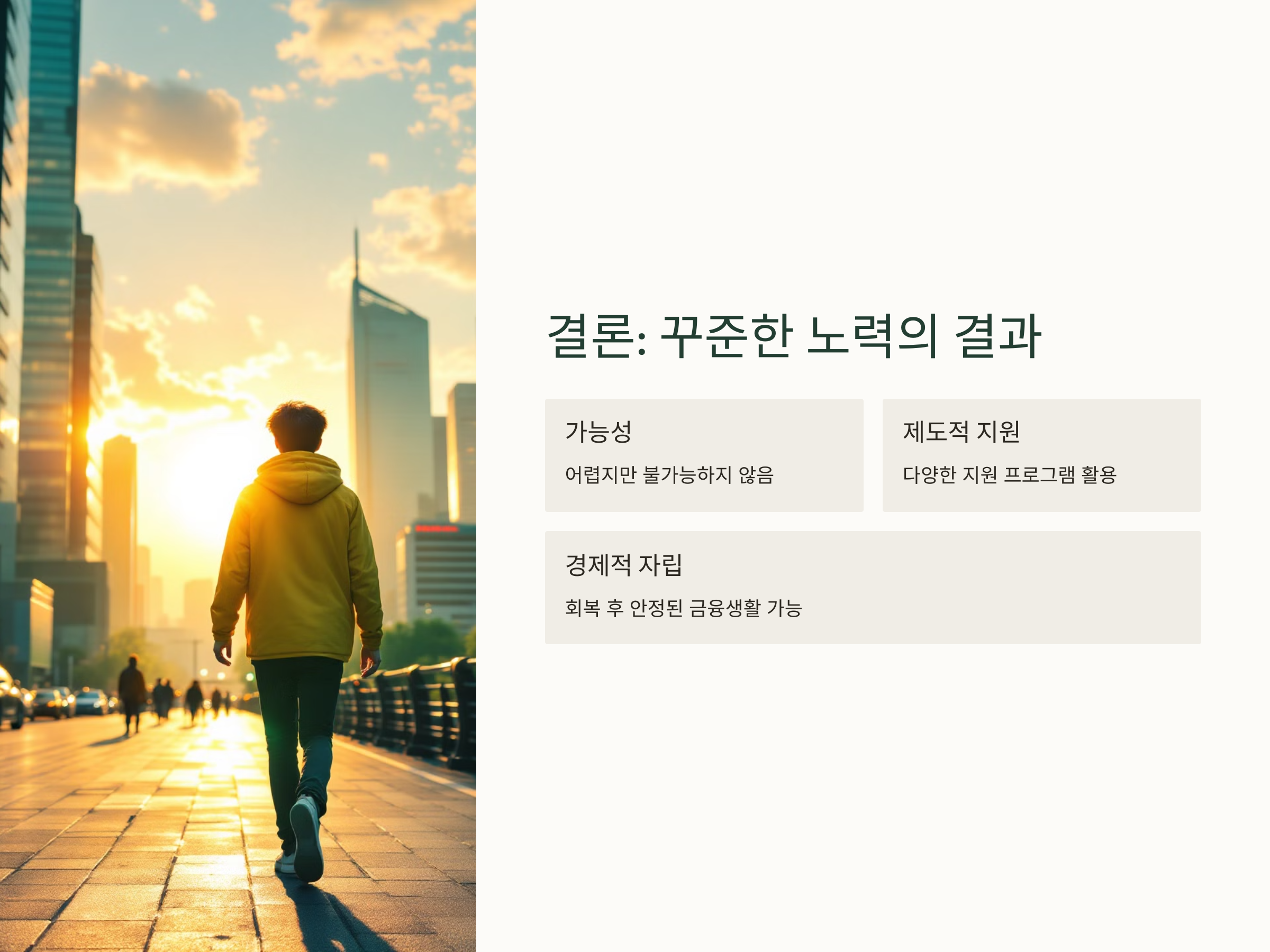 개인파산 후 신용을 회복하는 것은 분명 어려운 과정이지만, 불가능한 일은 아닙니다. 신용회복을 위한 여러 가지 제도적 지원과 자신만의 금융 관리를 통해 꾸준히 노력한다면, 과거의 금융 문제를 극복하고 다시 나은 금융 생활을 시작할 수 있습니다. 신용회복은 시간이 걸리지만, 신용을 회복한 후에는 안정된 경제적 자립을 이룰 수 있습니다.