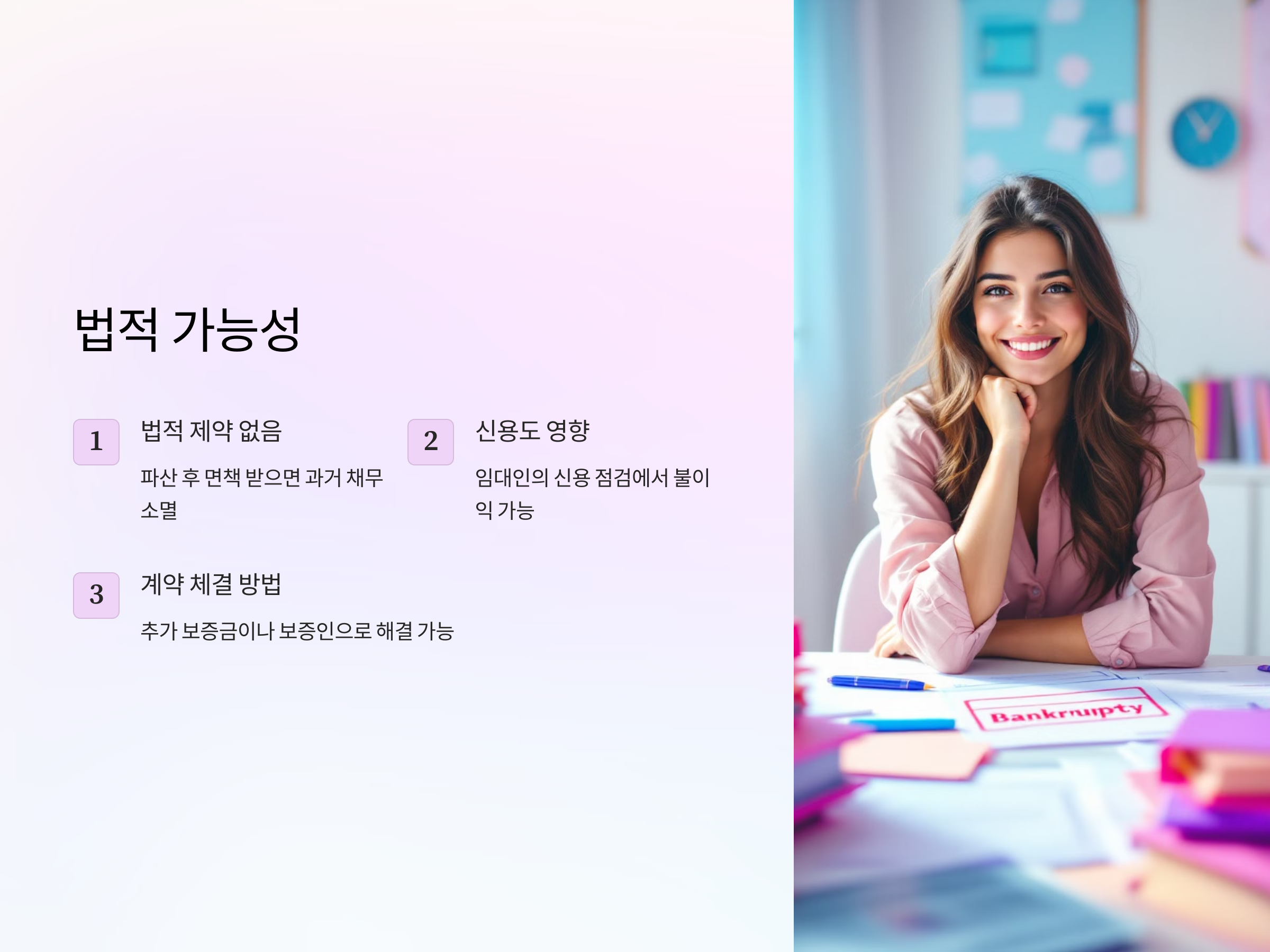 하지만 이러한 문제는 해결할 수 있는 방법이 있습니다. 예를 들어, 파산 후 신용이 회복되지 않은 상태에서 계약을 체결하려면 보증금을 추가로 지급하거나 보증인을 세우는 방법이 있습니다. 일부 임대인은 파산 기록을 크게 신경 쓰지 않는 경우도 있으므로, 임대인의 입장에서 신용 회복 여부와 더불어 보증금이나 보증인의 조건을 충족할 수 있다면 계약을 체결할 수 있습니다.