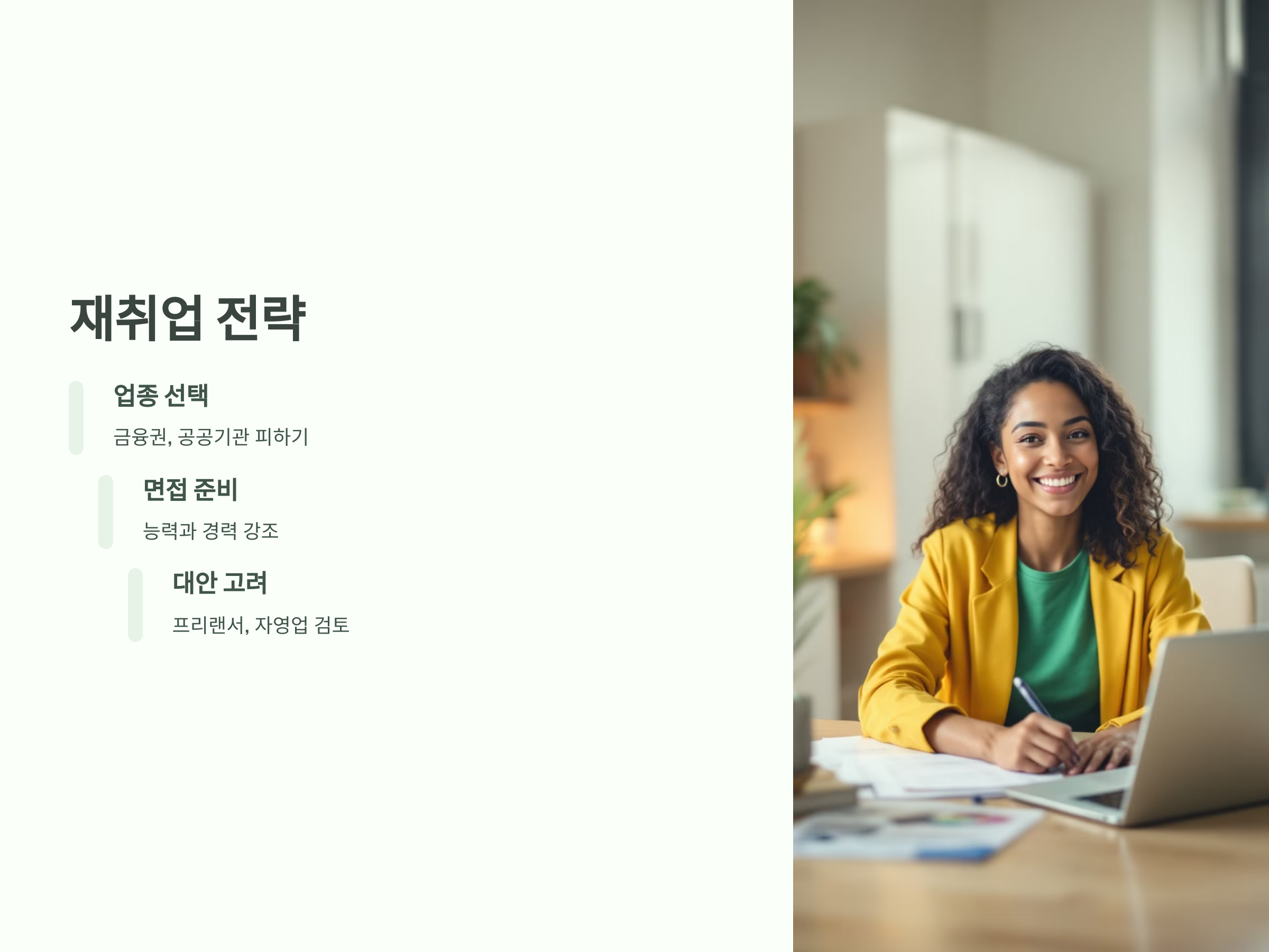 - 기술 직종 전환: 금융권이나 공공기관 취업이 어려울 경우, IT, 디자인, 요식업 등 기술 기반의 직종으로 전환하는 것도 좋은 방법입니다.