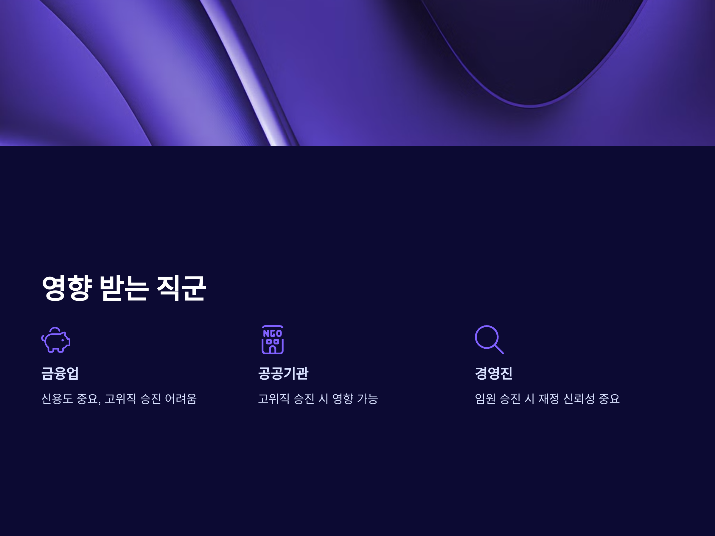 - 은행, 증권사, 보험사 등 금융기관에서는 직원의 신용도를 중요하게 평가합니다.