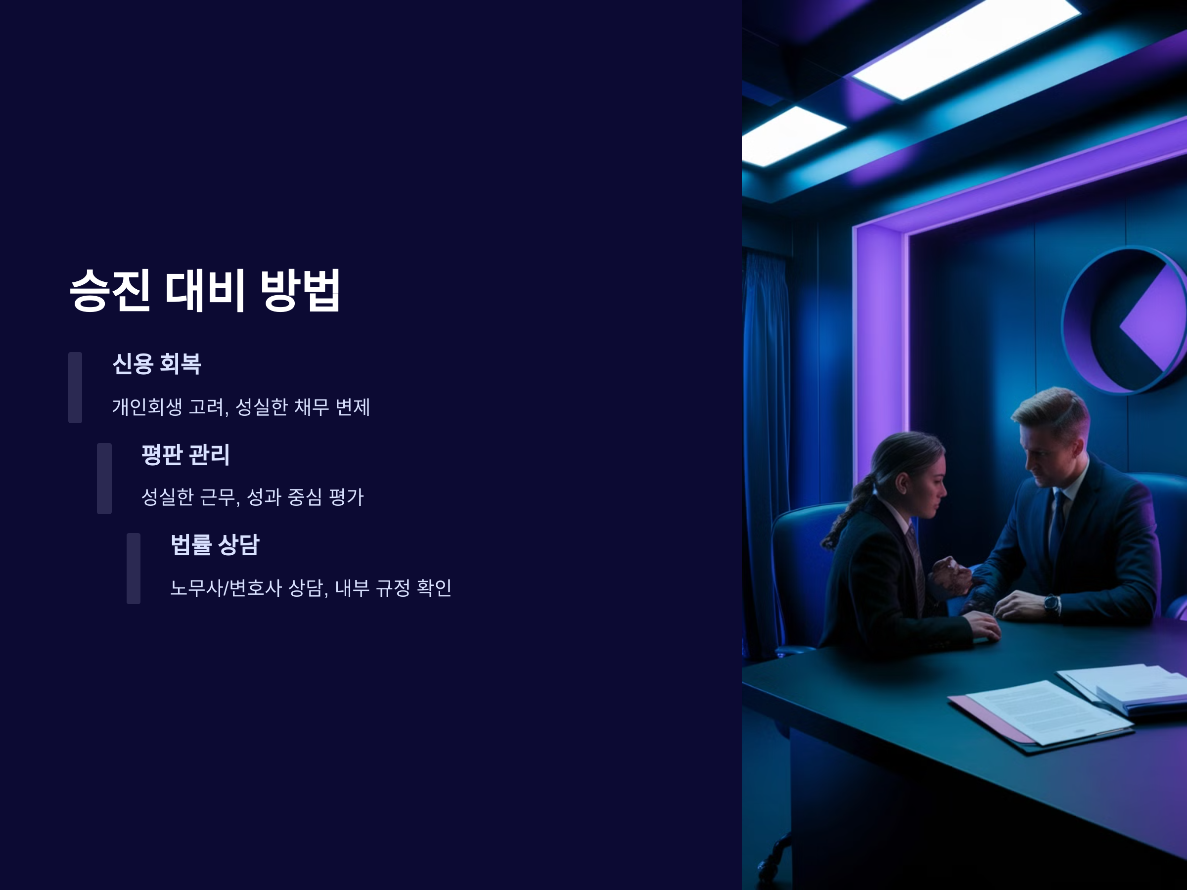 - 기업의 내부 규정 확인: 회사 내부 승진 규정을 미리 체크하면 불이익을 최소화할 수 있습니다.