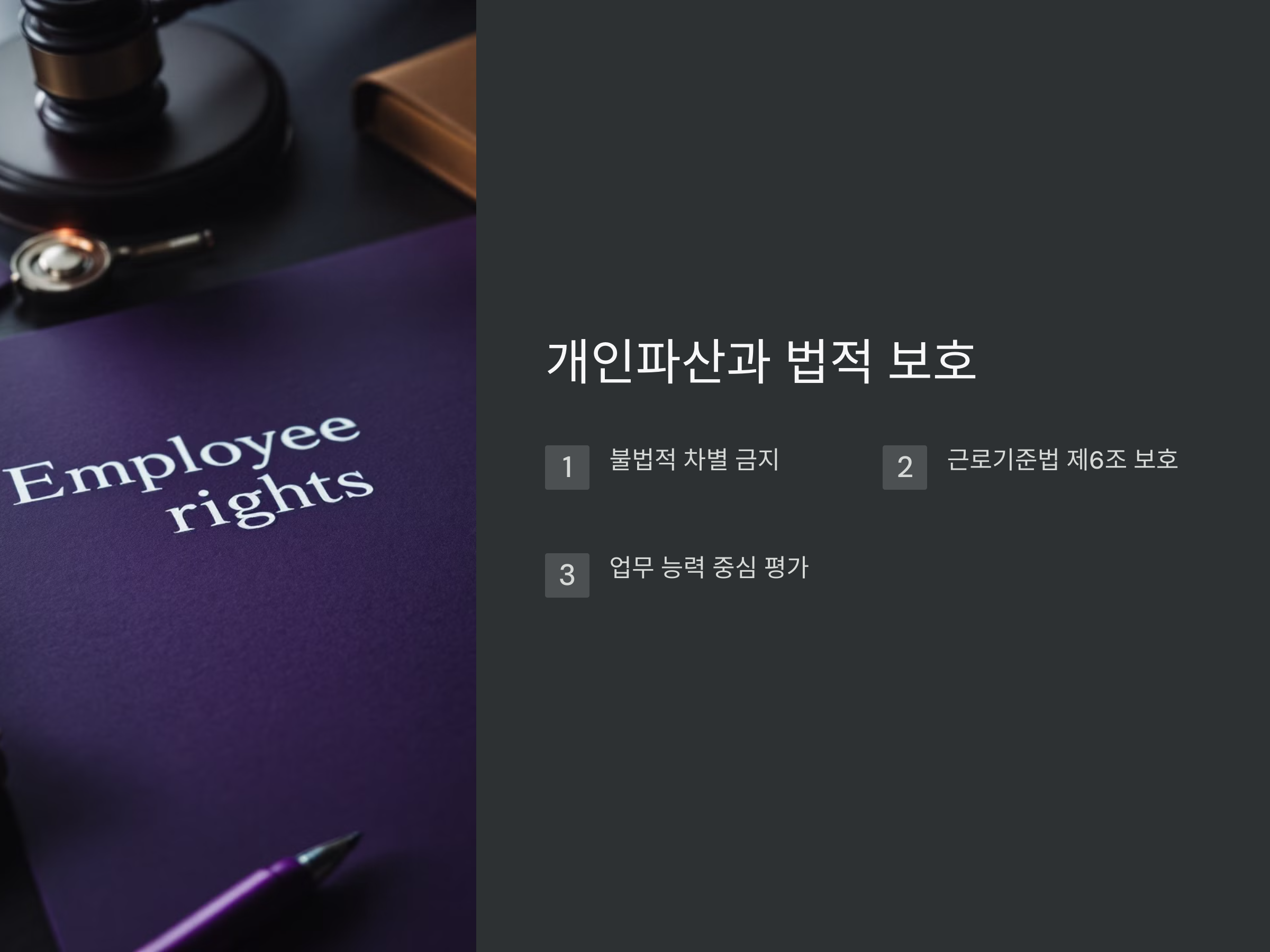 개인파산은 개인의 신용도를 회복하기 위한 제도적 절차이지만, 이를 이유로 직장에서 승진에 제한을 두는 것은 불법입니다. 사실, 한국의 경우, 개인파산을 이유로 직장 내에서 불이익을 주는 것은 법적으로 금지되어 있습니다. 이는 "근로기준법"에 의한 보호를 받기 때문인데, 근로자는 개인적인 재정 상황이나 과거에 관한 이유로 승진이나 고용에 차별을 받지 않아야 한다는 원칙이 있습니다. 따라서, 파산 후에도 업무 능력이 뛰어나면 승진 기회는 여전히 열려 있습니다.