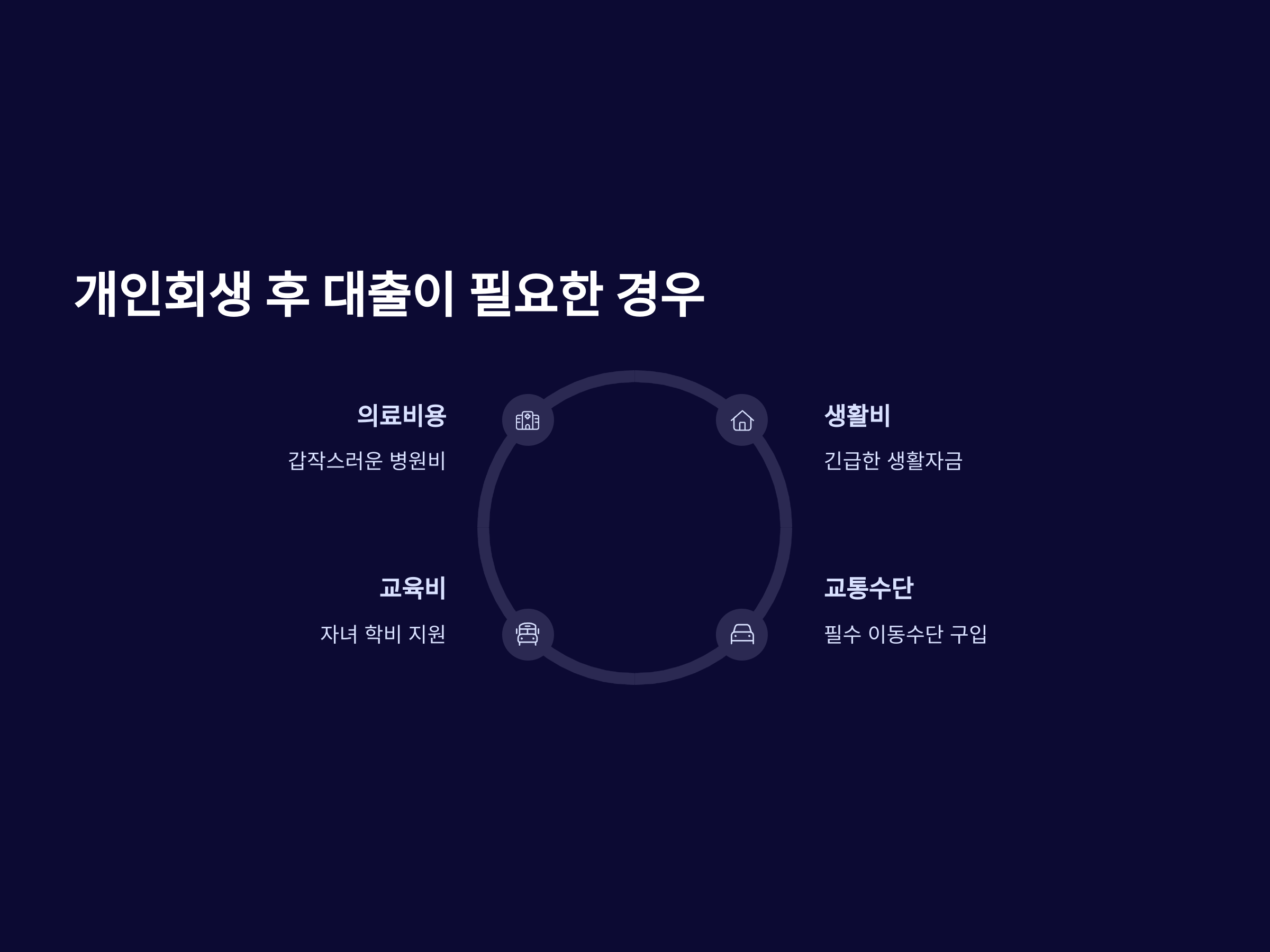 개인회생을 완료한 후 대출이 필요한 경우가 있을 수 있습니다. 예를 들어, 큰 의료비용이나 갑작스러운 생활비 부담 등 긴급한 상황에서 대출이 필요할 수 있습니다. 이럴 때 대출을 받을 수 있는 방법을 찾아보는 것이 중요하며, 대출 받기 전에 반드시 상환 계획을 세워야 합니다.