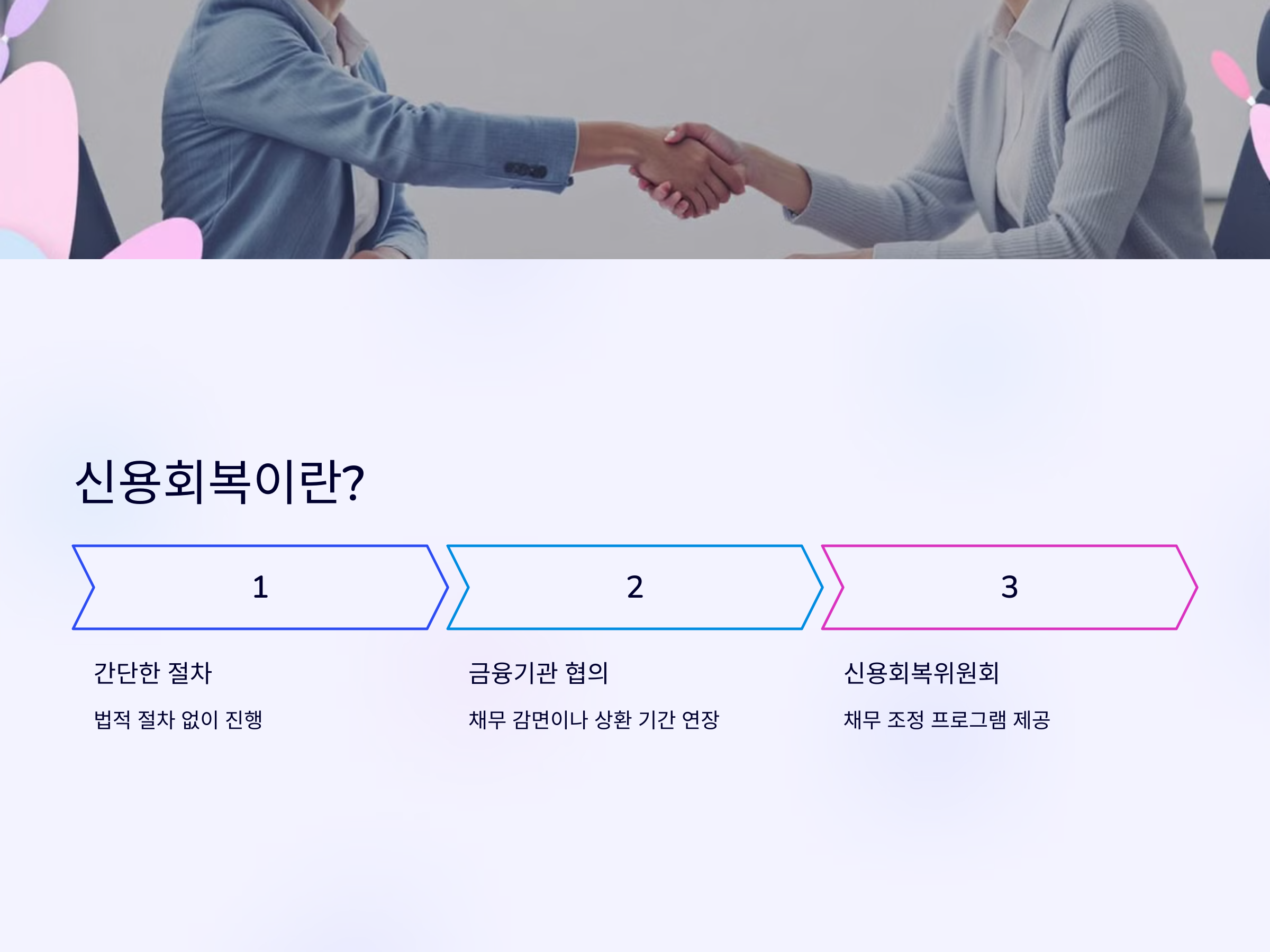 신용회복은 개인회생보다는 좀 더 간단하고, 법적인 절차를 거치지 않는 방식입니다. 이는 신용카드나 대출 등으로 인한 채무를 상환할 능력이 부족할 때, 정부나 금융기관에서 제공하는 프로그램을 통해 일정 부분 채무를 감면받거나 상환 기간을 연장하는 방법입니다. 신용회복은 대출을 받은 금융기관들과 협의하여 이루어지기 때문에, 법원의 개입 없이 진행할 수 있는 장점이 있습니다.
