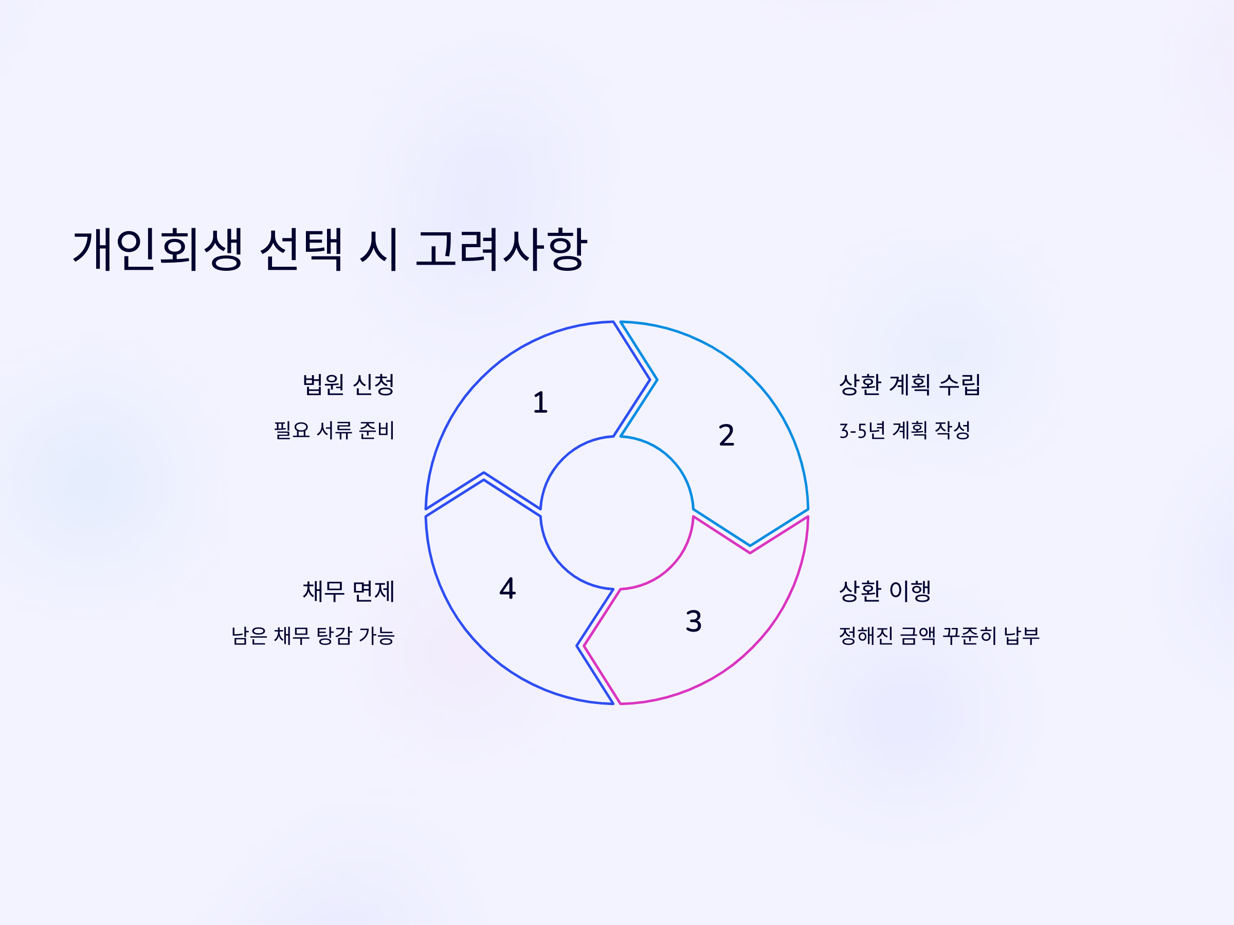 개인회생은 개인이 채무를 상환할 능력이 부족할 때, 일정 기간 동안 법원이 정한 상환 계획에 따라 일부 채무를 탕감받고 나머지를 분할 상환하는 제도입니다. 주로 소득이 일정하고, 자산이 많지 않지만 채무가 큰 사람들에게 적합합니다. 개인회생은 법적 절차를 따르며, 법원이 개입하여 상환 계획을 수립하고 이를 이행하는 방식으로 진행됩니다.