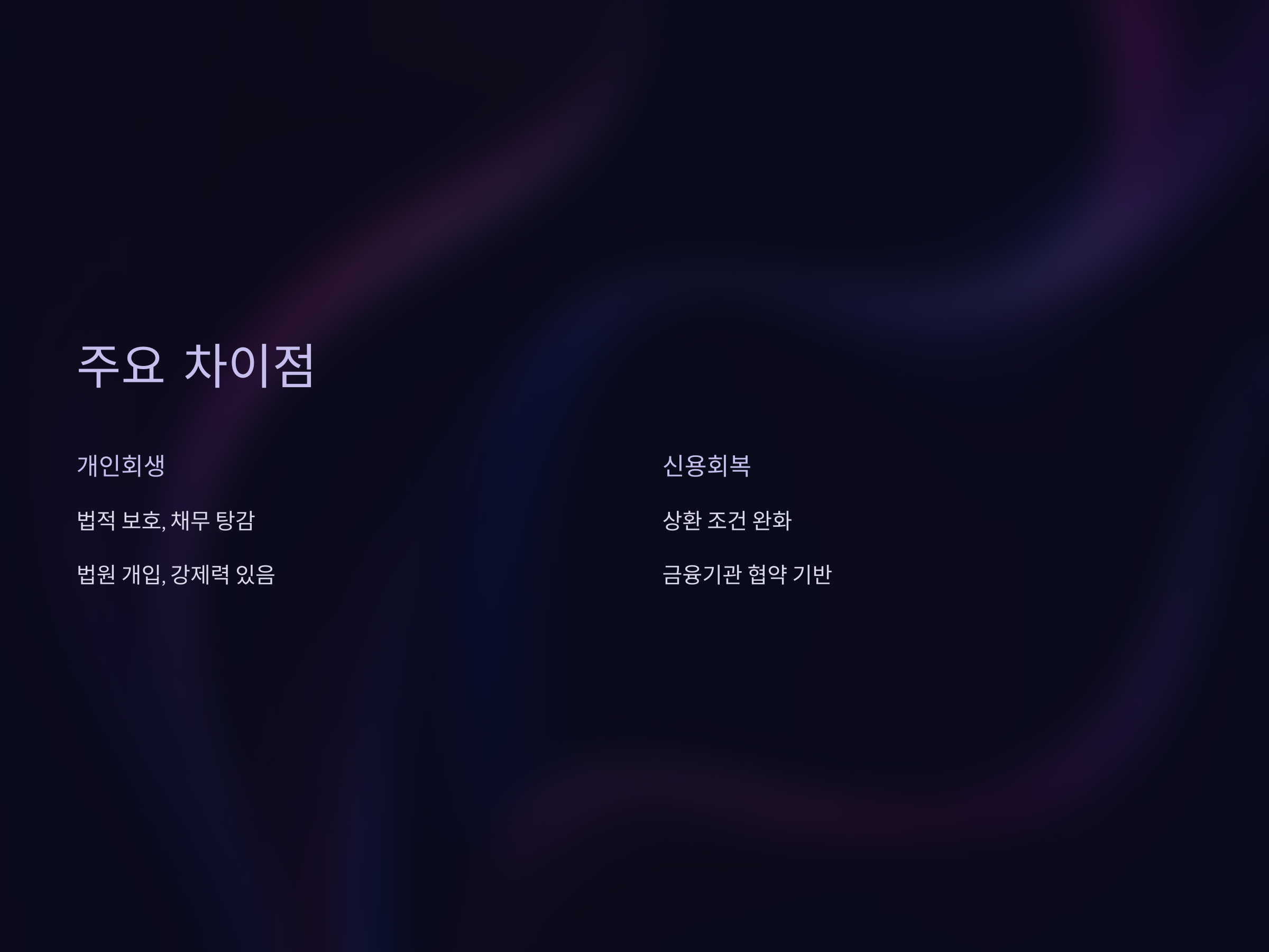 - 절차: 법원에 개인회생 신청 → 변제계획안 승인 → 일정 기간 동안 변제금 납입.