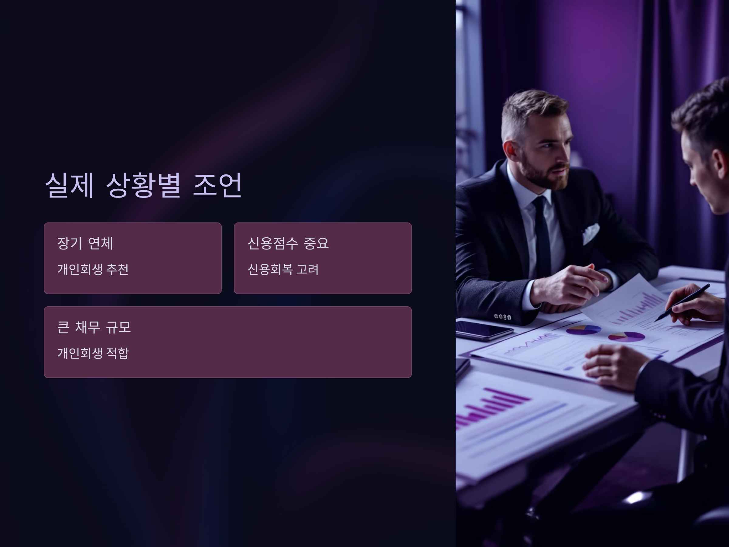 - 채무 규모가 크고 소득 대비 부담이 지나치게 클 경우 개인회생 추천.