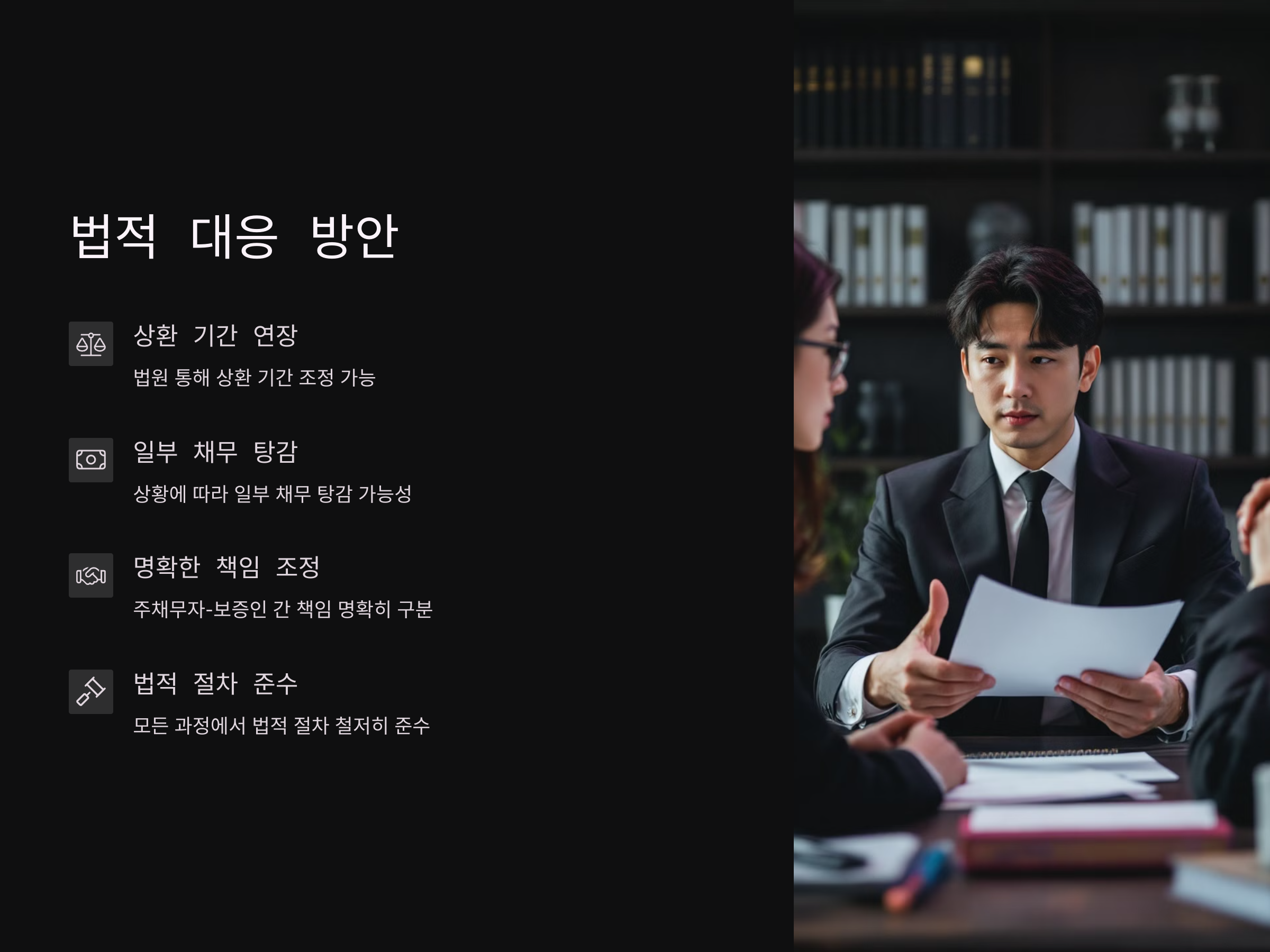 연대보증 채무에 대한 법적 대응은 채무자의 상황에 따라 달라질 수 있습니다. 연대보증인이 대신 상환 의무를 지고 있는 채무가 있다면, 이 부분에 대해서도 법적인 절차를 통해 해결할 수 있습니다.