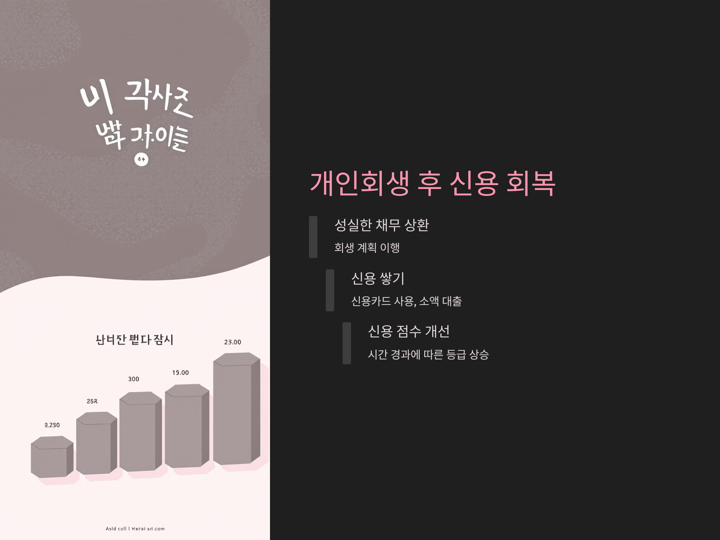 법원에서 승인받은 회생 계획에 따라 채무를 상환하고, 이후 신용 회복을 위해 신용카드 사용, 소액 대출 등의 방법으로 신용을 쌓는 것이 필요합니다. 이 과정에서 신용 점수는 조금씩 회복될 수 있으며, 결국 신용 등급을 높일 수 있습니다.