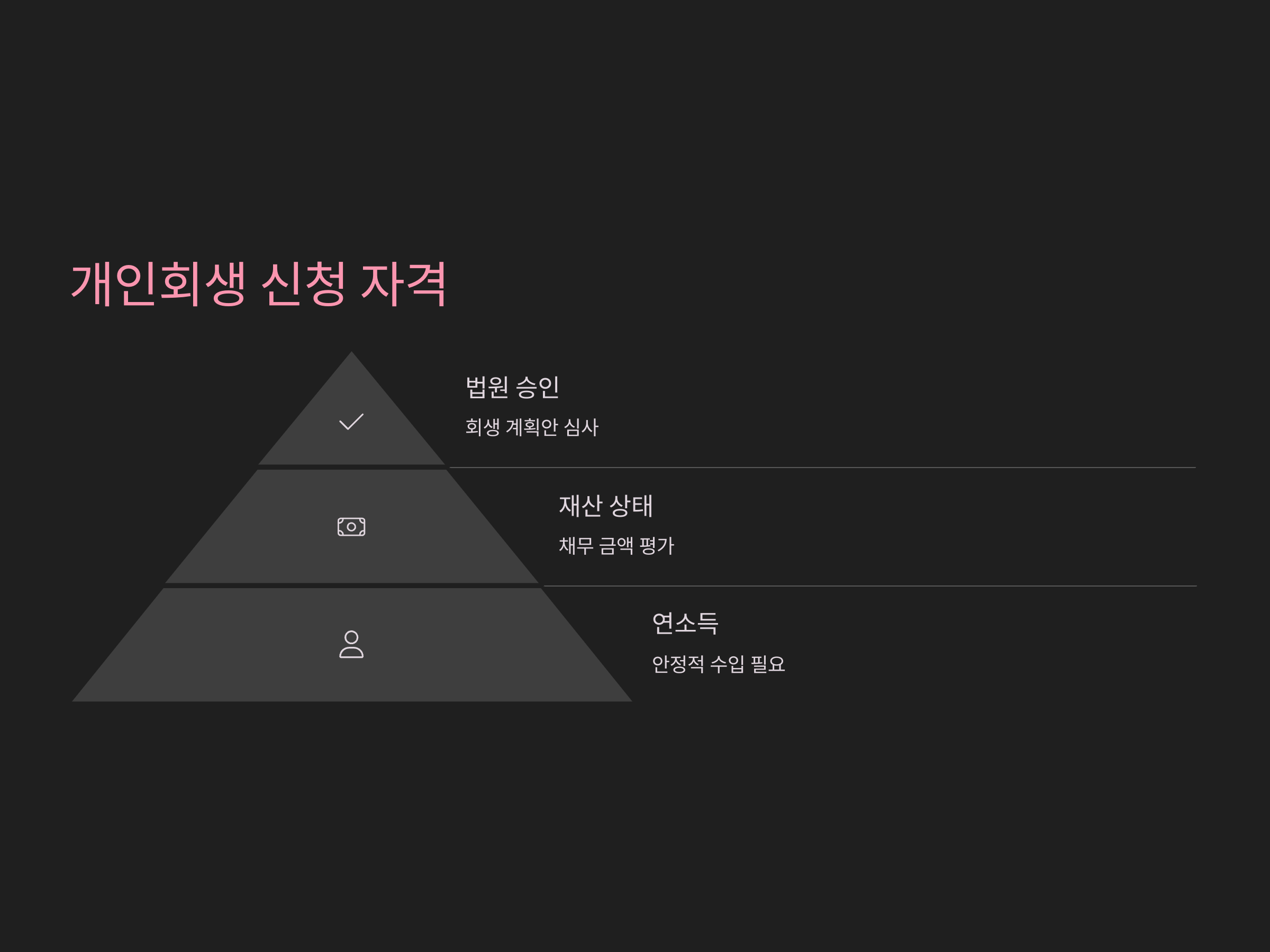 - 신청 자격: 개인회생 신청 자격은 일정한 기준을 충족해야 합니다. 연소득, 채무 금액, 기타 재산 상태 등이 중요한 평가 요소가 됩니다.