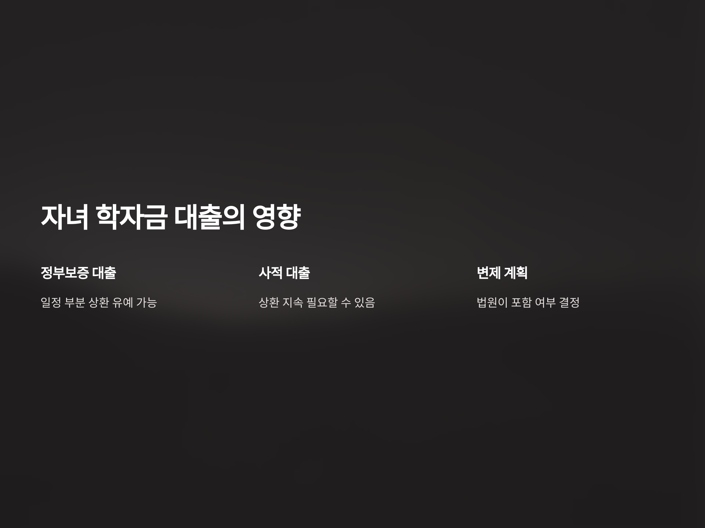 만약 학자금 대출이 사적 대출이라면 상환 계획을 수립하는 데 있어 자녀의 학자금 대출을 별도로 고려하여 금액을 조정하는 방법을 모색할 수 있습니다. 개인회생을 신청한 후에는 법원의 결정에 따라 학자금 대출의 일부 또는 전액이 탕감될 수 있으며, 이 경우 학자금 대출도 변제 계획에 포함되어 갚아 나갈 수 있게 됩니다.
