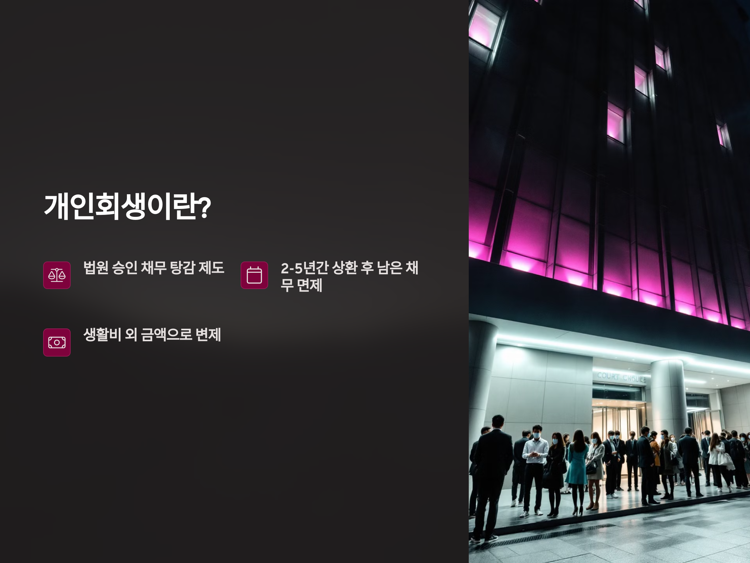 개인회생은 재정적 어려움을 겪고 있는 사람이 법원의 승인을 받아 채무를 일부 갚고 나머지를 탕감받는 제도입니다. 이 제도는 원칙적으로 2년에서 5년 동안 일정한 금액을 상환하면서 회생을 목표로 합니다. 이 기간 동안 개인회생 채무자는 생활비 외의 금액을 변제하며, 일정 기간이 지나면 남은 채무가 면제됩니다.