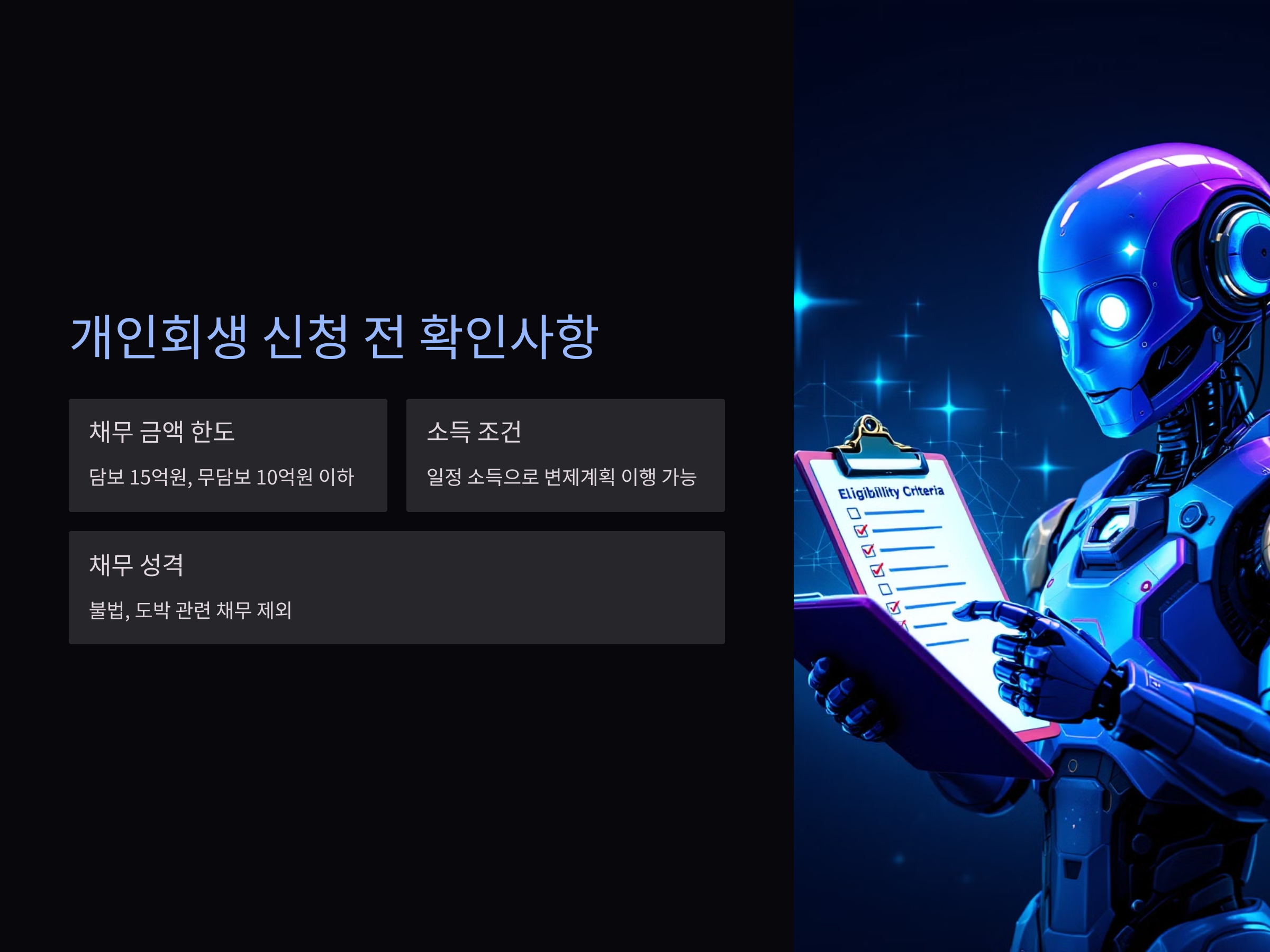 - 담보채무는 15억 원, 무담보채무는 10억 원 이하이어야 합니다.