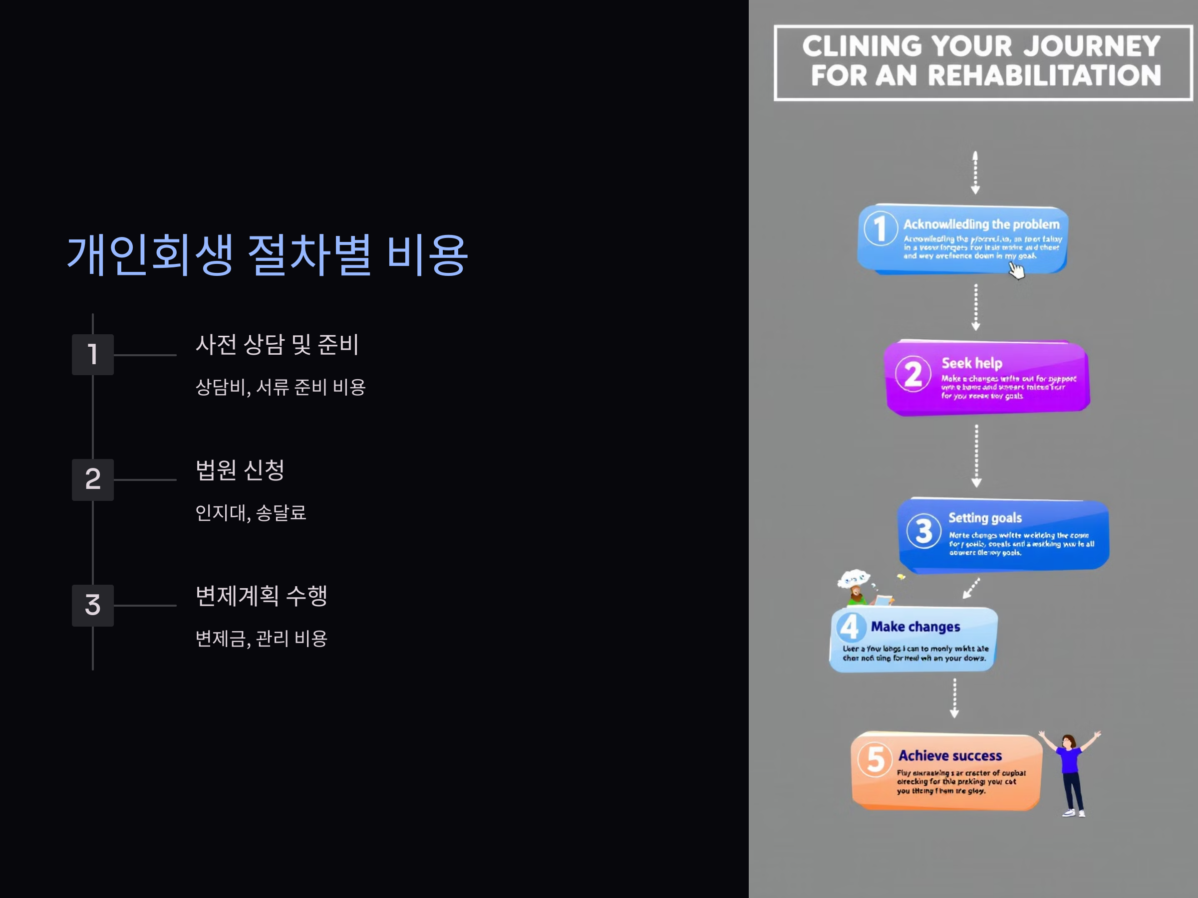 - 경제적으로 어려운 분들은 대한법률구조공단을 통해 개인회생을 진행할 수 있으며, 이 경우 약 50만 원~100만 원 정도의 비용이 듭니다.