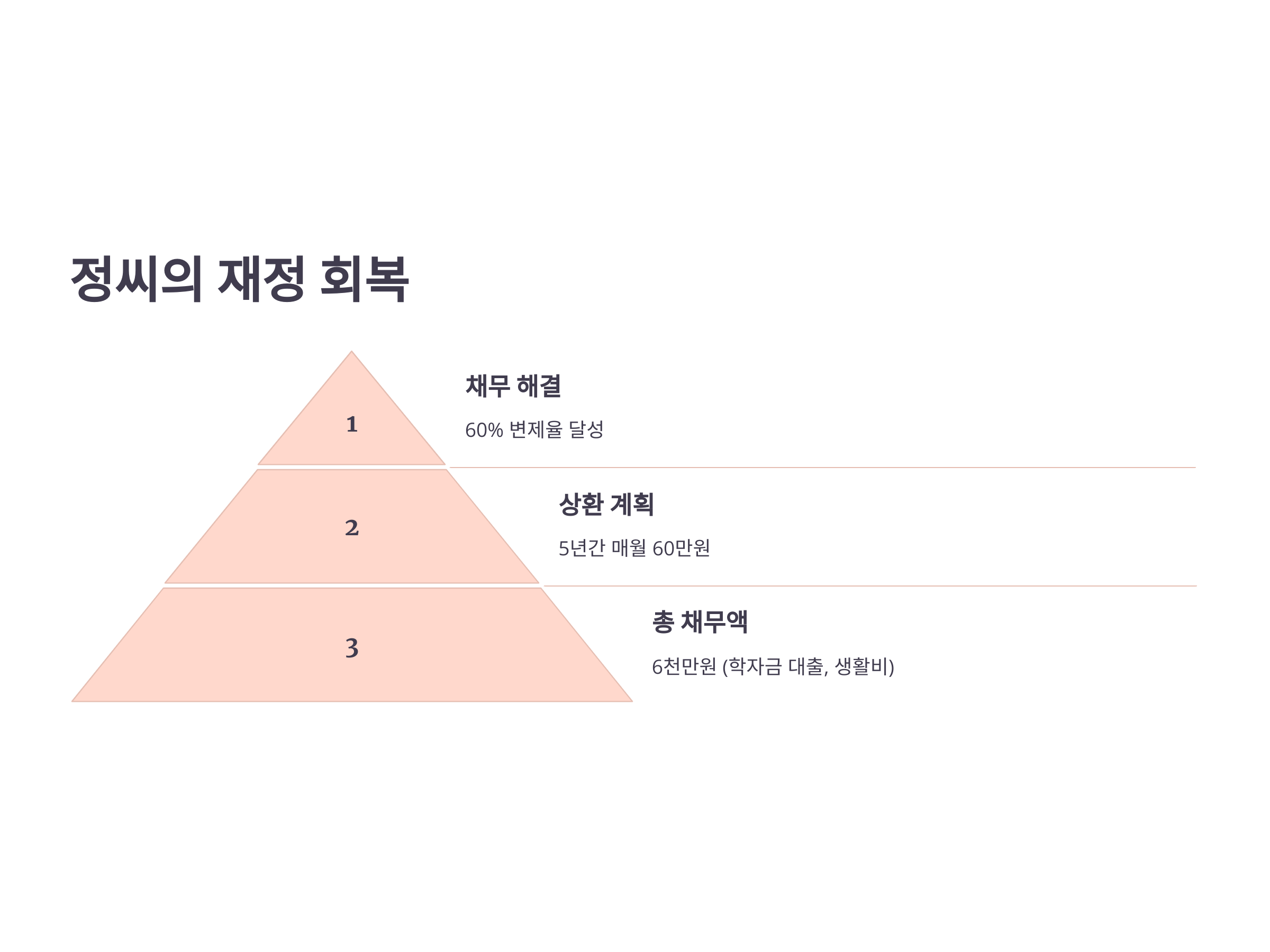 정씨는 학자금 대출과 생활비로 인해 6천만 원의 채무가 있었습니다. 개인회생 절차를 통해 정씨는 다음과 같은 변제 계획을 수립하였습니다: