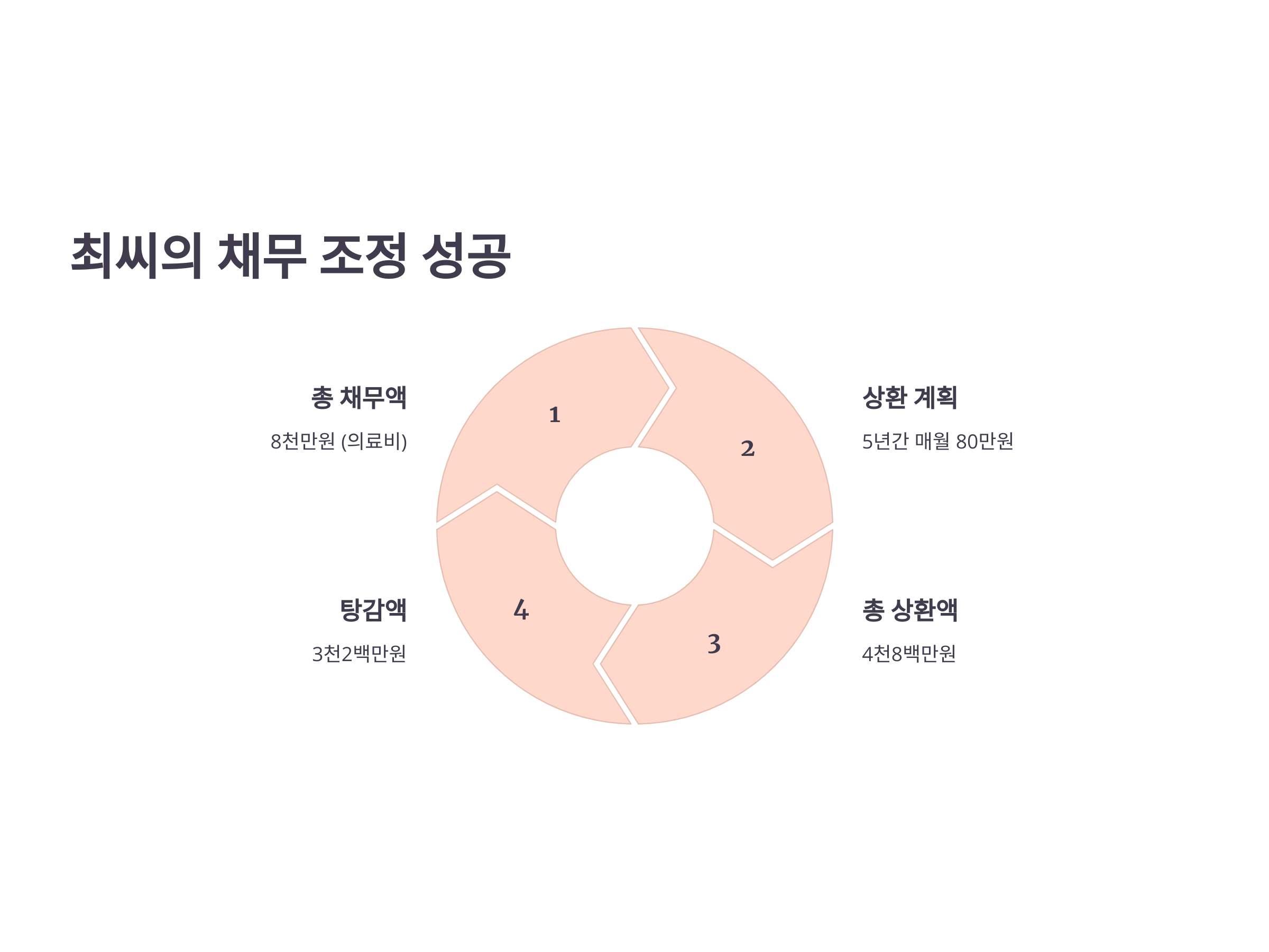 최씨는 갑작스러운 의료비로 인해 8천만 원의 채무가 발생하였습니다. 개인회생 절차를 통해 최씨는 다음과 같은 변제 계획을 수립하였습니다: