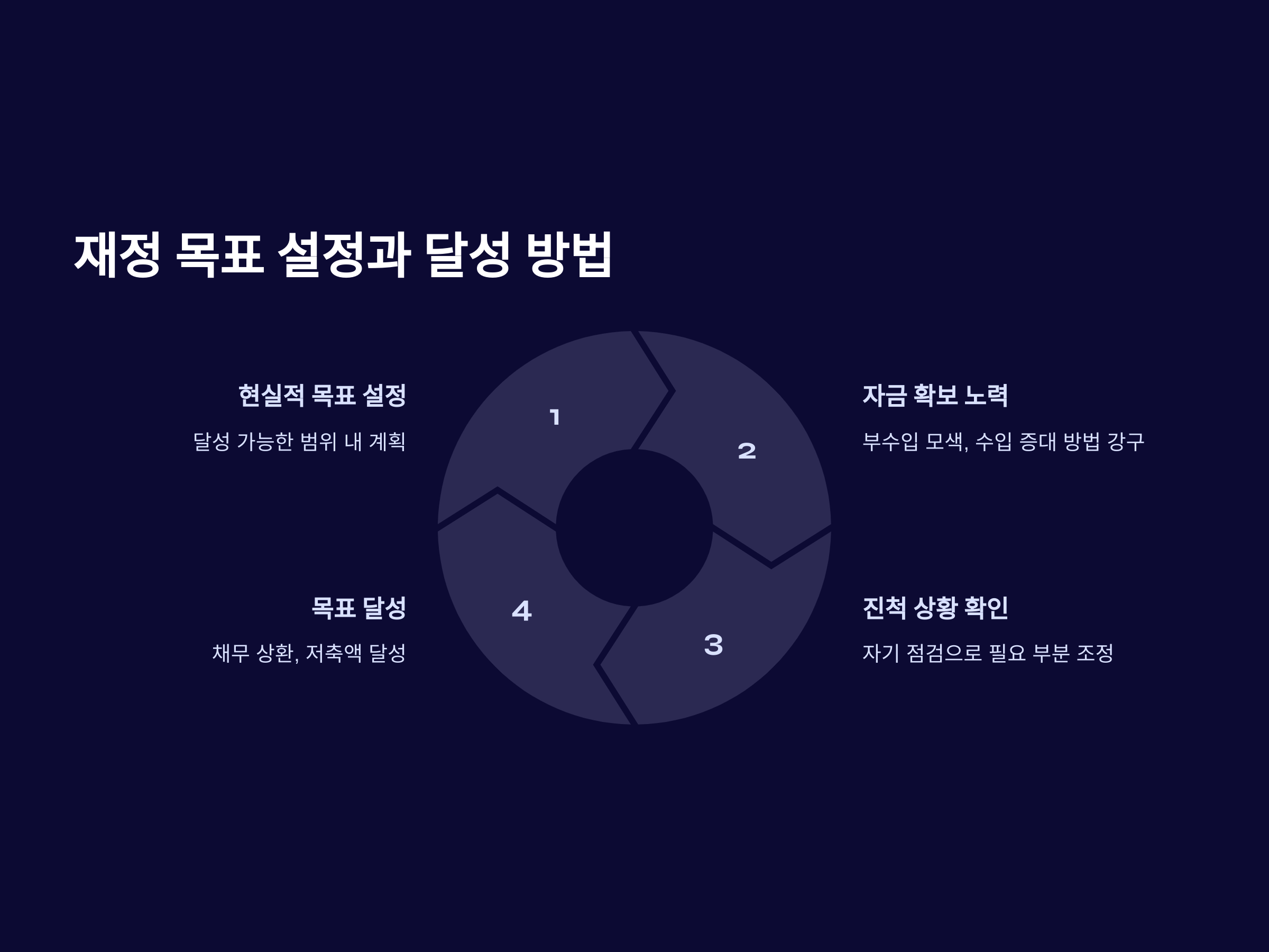 재정 목표를 설정한 후에는 목표를 이루기 위해 필요한 자금을 확보할 수 있도록 꾸준히 노력해야 합니다. 이를 위해 부수입을 얻을 수 있는 방법을 모색하거나, 수입을 증대시키기 위한 방법을 강구하는 것이 필요합니다. 목표 달성의 과정에서 자기 점검을 통해 진척 상황을 확인하고, 필요한 부분을 조정하는 것도 중요한 부분입니다.