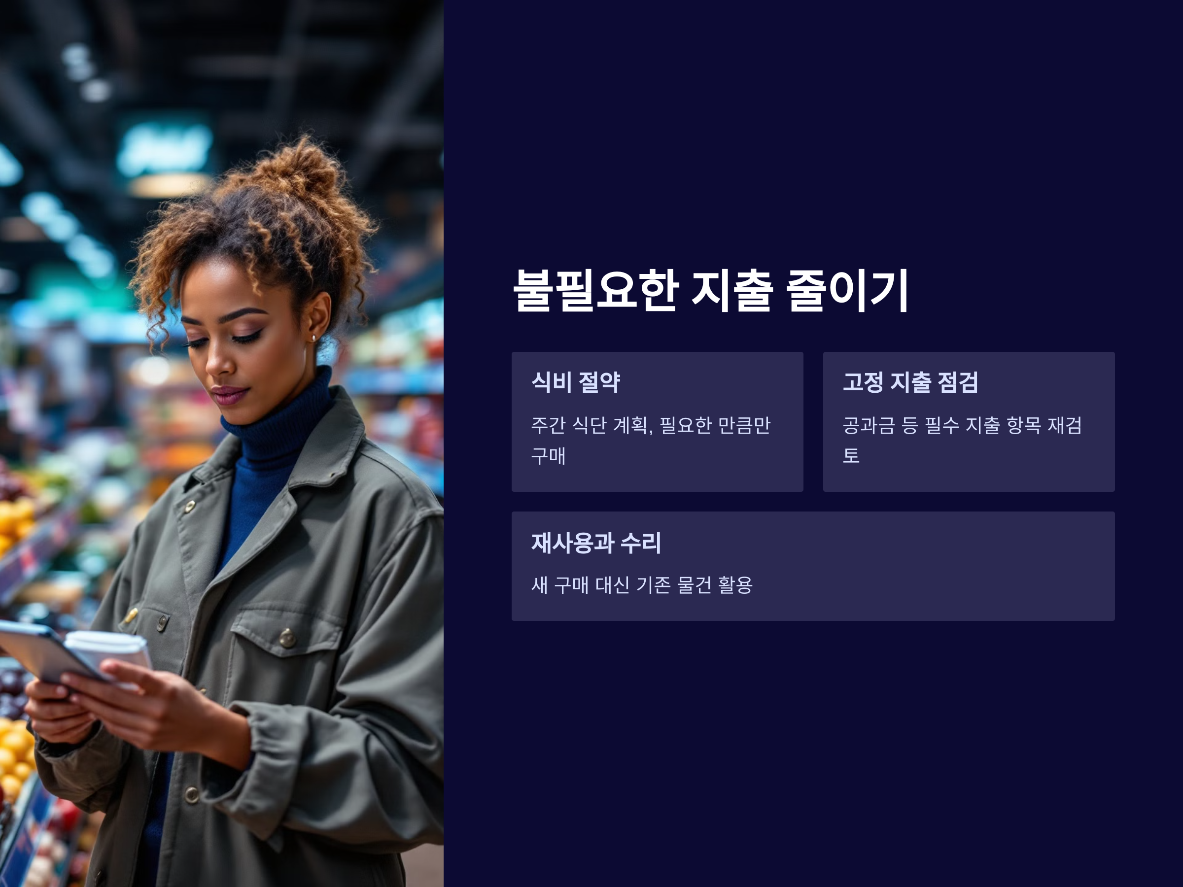 예를 들어, 식비나 외식비를 줄이는 방법은 매주 식단을 계획하고 필요한 만큼만 구매하는 것입니다. 또한, 공과금과 같은 고정 지출 항목도 점검하여 불필요한 부분을 줄일 수 있습니다. 가전 제품이나 가구를 새로 구입하는 대신 기존에 있는 것을 수리하거나 재사용하는 것도 좋은 방법입니다. 이처럼 작은 절약이 쌓여서 큰 차이를 만들어낼 수 있습니다.