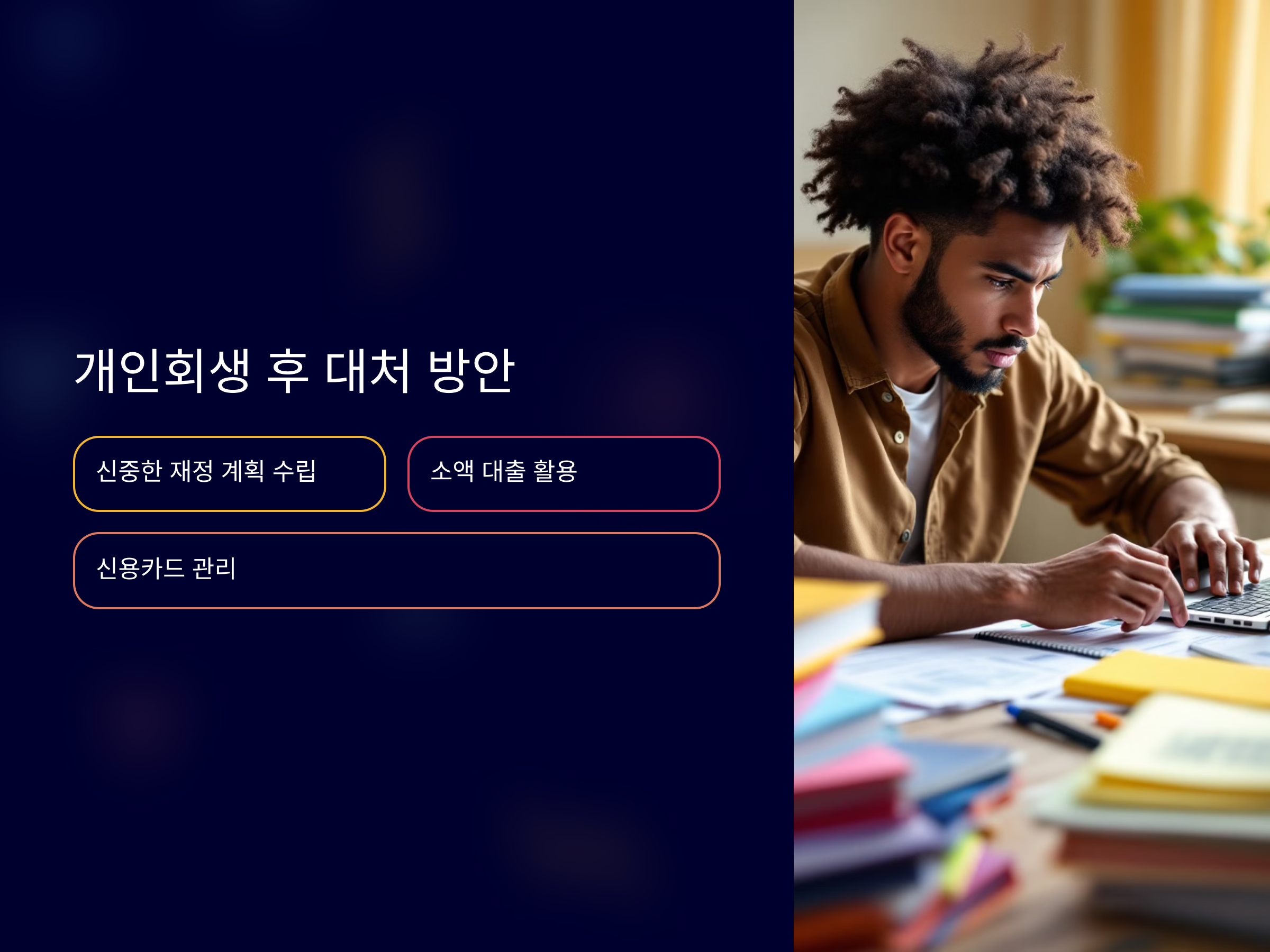 개인회생을 통해 채무를 갚고 새로운 시작을 할 수 있는 기회는 크지만, 그 과정에서 금융거래에 대한 제약이 따른다는 점은 반드시 인지해야 합니다. 이러한 제약을 극복하고 점진적으로 신용을 회복할 수 있는 방법들을 잘 활용하며 재정적 안정을 꾀해야 합니다.