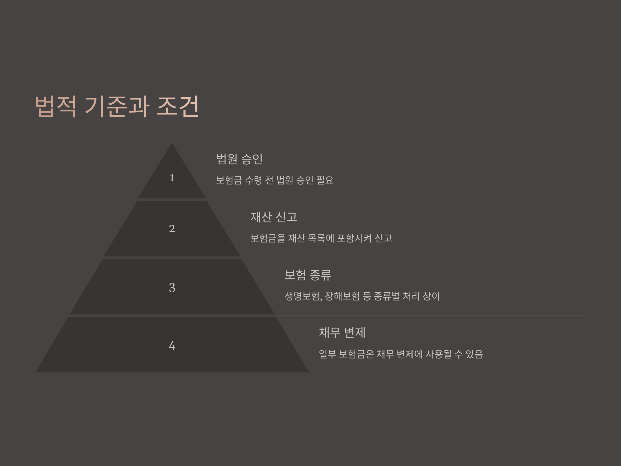 보험금의 종류에 따라 달라지며, 예를 들어 생명보험과 같은 경우에는 보험금 수령 시 채무자에게 직접 지급되기 전에 법원의 승인이 필요한 경우가 있습니다. 이는 채무자가 보험금을 수령하면 그 금액이 채무 변제에 사용될 수 있기 때문입니다. 반면, 일부 보험금은 생명보험 외에도 장해보험, 질병보험 등 다양한 종류가 존재하며, 이런 경우에는 채무자에게 직접 지급되는 경우도 있지만, 법적인 제약을 받을 수 있습니다.