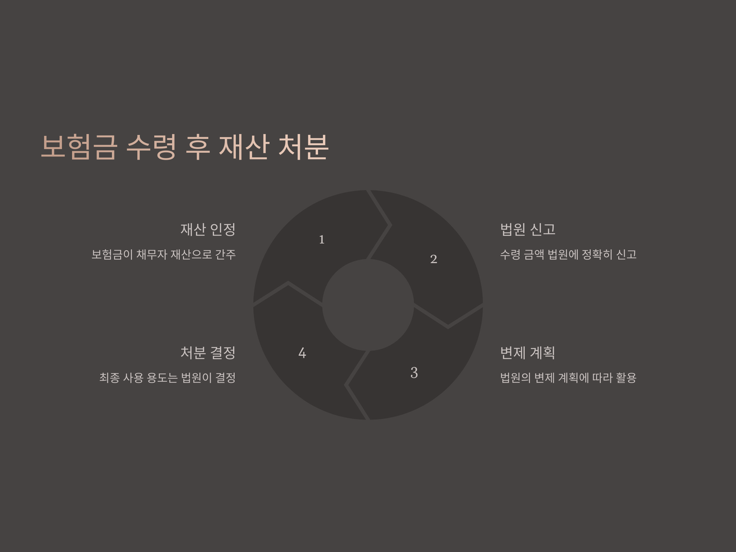 보험금을 수령한 후에는 해당 금액이 변제 자산으로 포함될 수 있기 때문에, 이를 법원에 신고해야 합니다. 만약 법원의 승인을 받지 않고 보험금을 수령하면, 나중에 법적 문제가 발생할 수 있습니다.