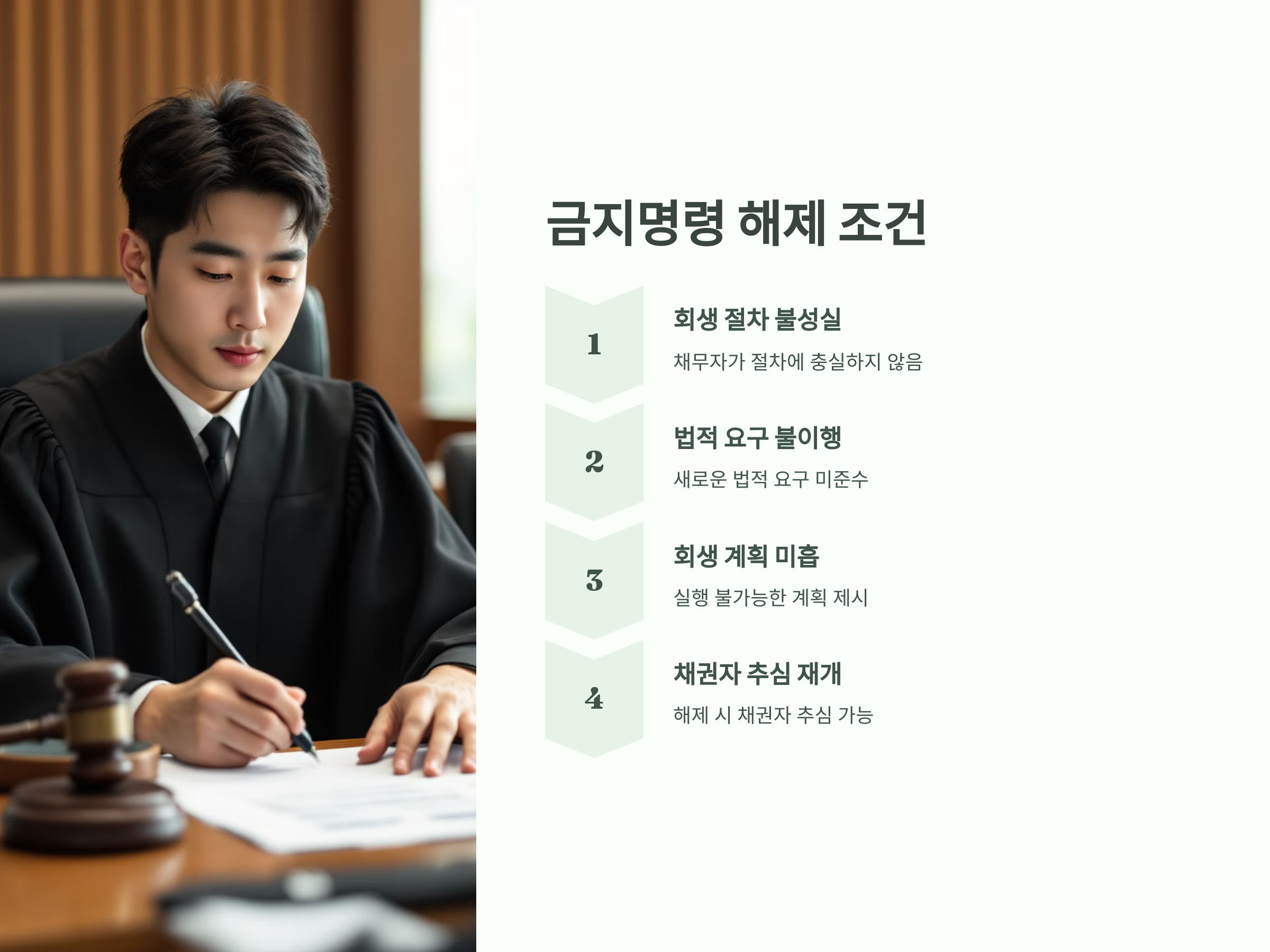 금지명령이 해제되는 경우는 주로 채무자가 회생 절차에 충실하지 않거나, 채무자가 새로운 법적 요구를 이행하지 않을 때 발생합니다. 또한 법원은 채무자가 제시한 회생 계획이 실행 가능한지 평가한 후, 계획이 미흡하다고 판단될 경우 금지명령을 해제할 수 있습니다.
