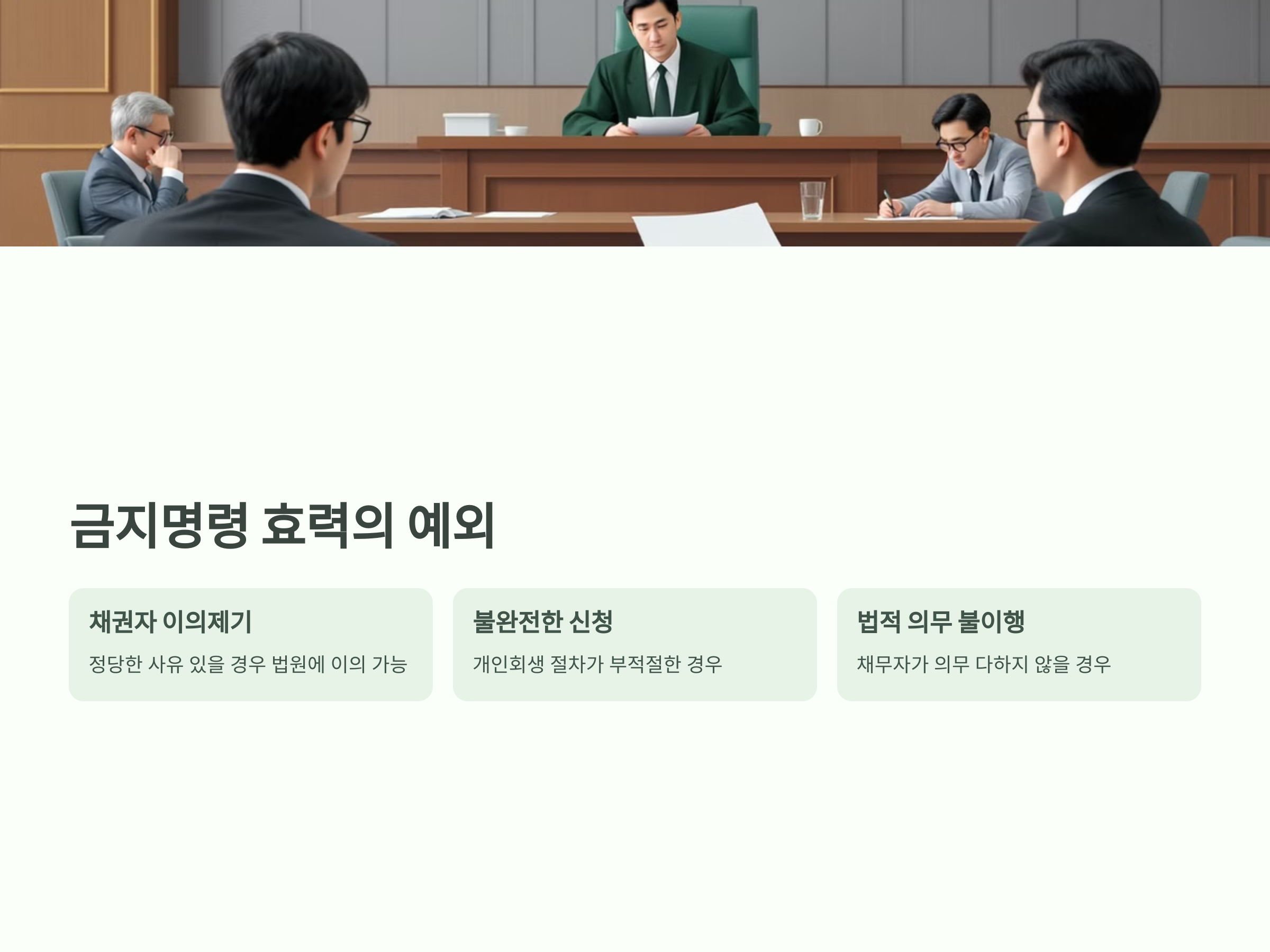 금지명령에도 예외가 존재할 수 있습니다. 예를 들어, 일부 채권자들은 금지명령의 효력을 무효화할 수 있는 사유가 있을 경우, 법원에 이의를 제기할 수 있습니다. 이때 법원은 금지명령을 일시적으로 해제하거나 효력을 제한하는 결정을 내릴 수 있습니다. 이러한 예외적인 상황은 채무자가 신청한 개인회생 절차가 불완전하거나 부적절한 경우에 발생할 수 있습니다.