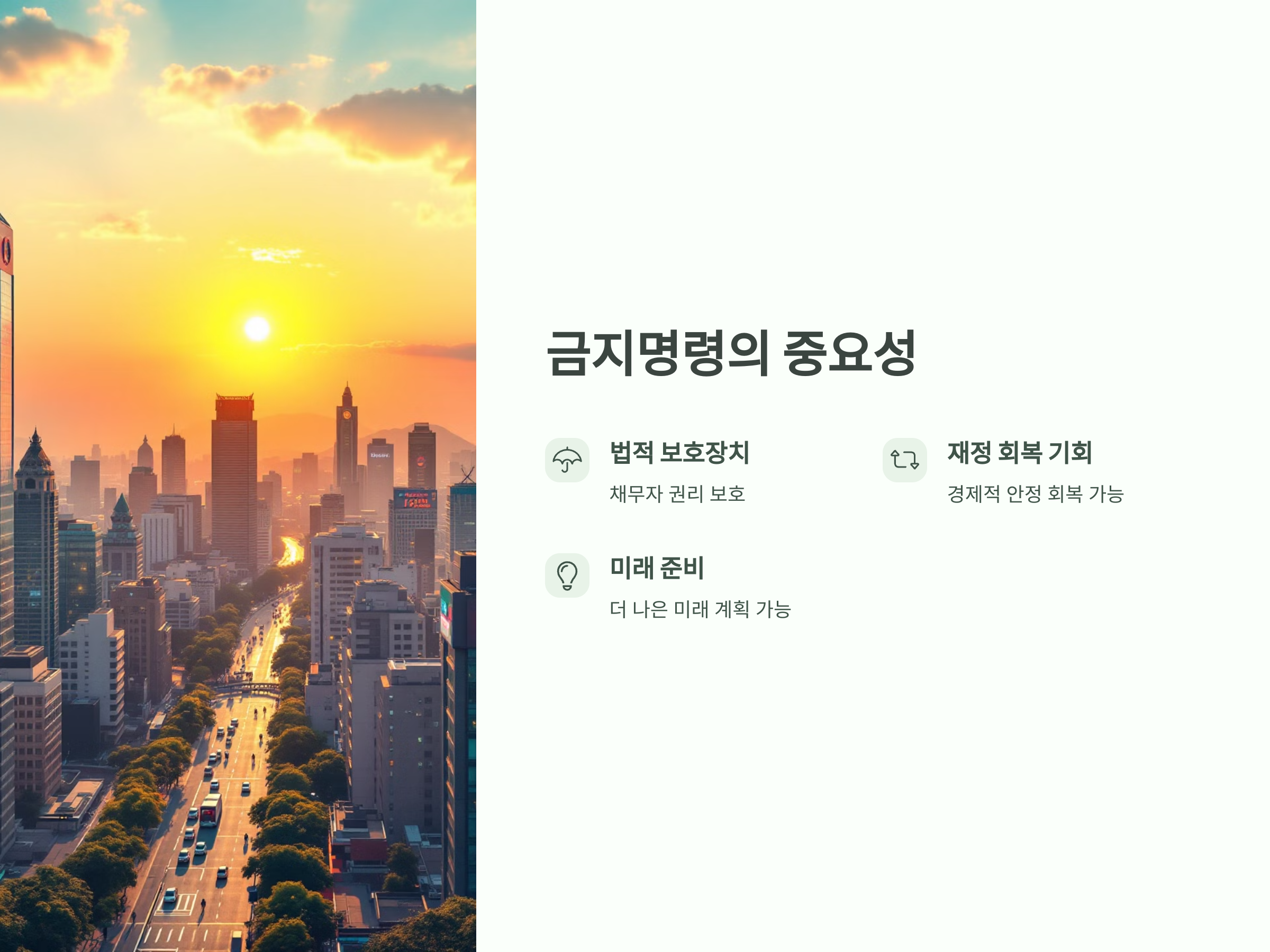금지명령의 주요 효과는 무엇보다도 채무자가 채권자의 압박을 받지 않고 회생 절차를 제대로 진행할 수 있도록 도와주는 것입니다. 이를 통해 채무자는 채권자들의 위협에서 벗어나 재정적인 회복을 위한 시간을 벌 수 있습니다. 이로 인해 채무자는 개인회생 절차 중에도 재정적인 안정을 찾을 수 있으며, 회생 계획을 차분히 수립할 수 있는 기회를 얻게 됩니다.