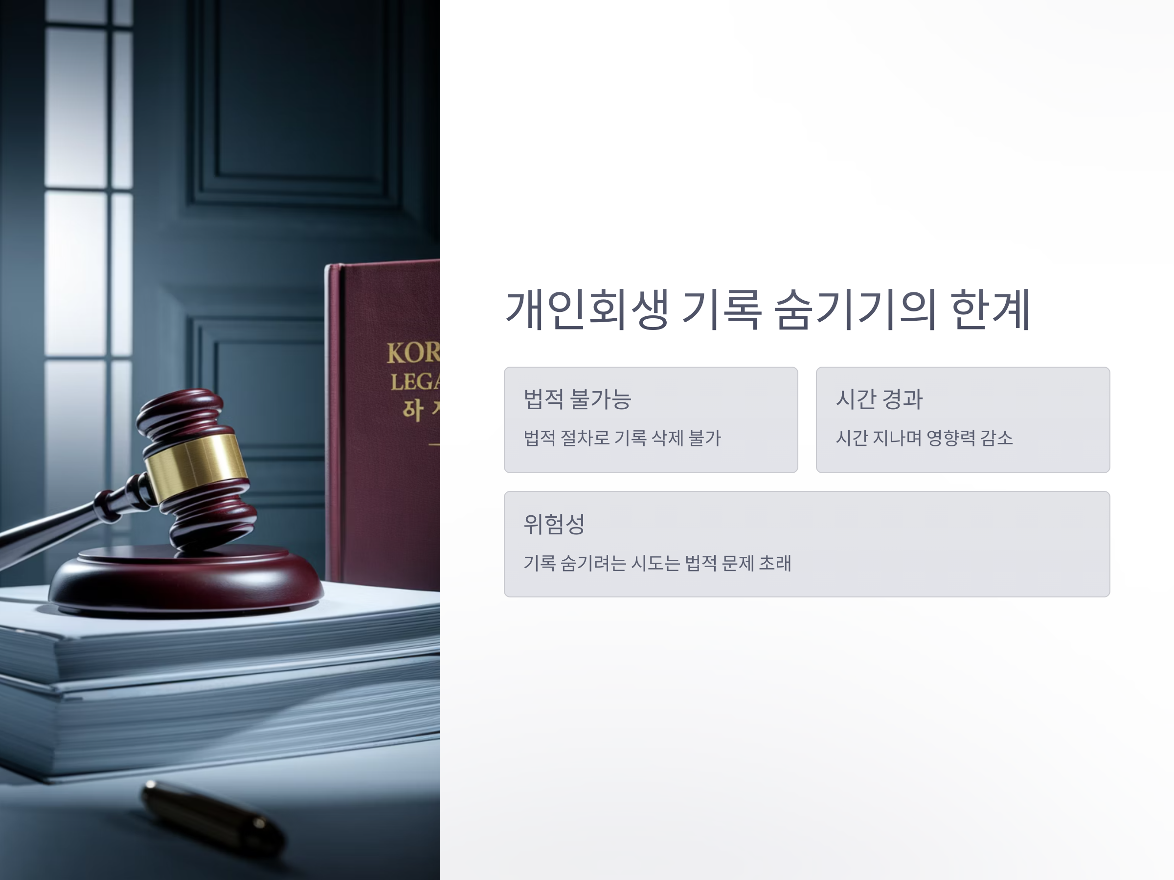 개인회생 기록을 숨기는 방법은 법적으로 불가능합니다. 개인회생은 법적 절차에 의해 이루어지며, 그 기록은 일정 기간 동안 남게 됩니다. 다만, 개인회생 절차를 마친 후에는 기록이 점차적으로 영향을 미치지 않도록 관리할 수 있습니다. 시간이 지나면서 신용 점수가 회복될 수 있도록 꾸준한 재정 관리를 통해 경제적 재기를 이루는 것이 중요합니다.