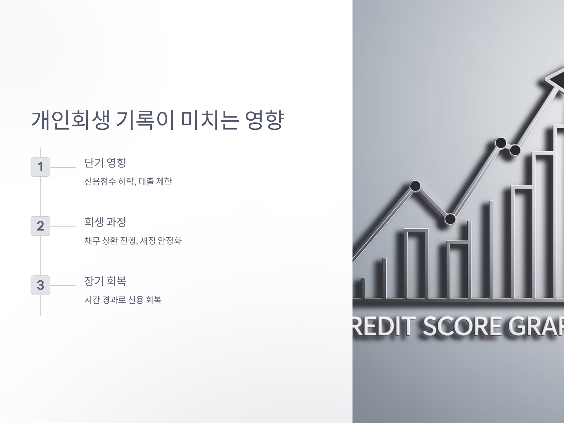 개인회생 기록이 남게 되면, 단기적으로는 신용 점수에 부정적인 영향을 미칠 수 있습니다. 특히, 개인회생을 신청한 사실이 신용등급에 반영되면 대출이나 신용카드 발급 시 불이익을 받을 수 있습니다. 그러나 이는 단기적인 문제일 뿐이며, 시간이 지나면서 회생 절차가 완료되고 채무를 해결한 사실이 신용 기록에 긍정적으로 반영될 수 있습니다.