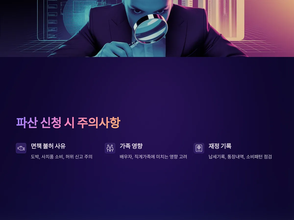 파산신청 시 흔히 놓치는 부분 중 하나는 ‘면책 불허 사유’입니다. 예를 들어 도박이나 사치품 소비, 허위 채권신고, 고의적인 재산 은닉 등이 확인될 경우, 면책이 기각될 수 있으니 매우 주의해야 합니다.