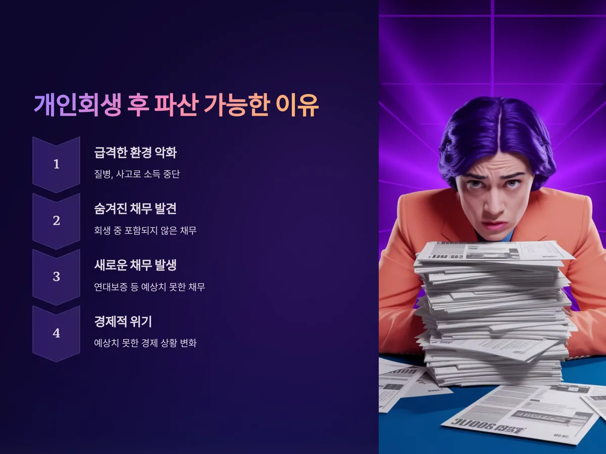 대표적인 사례는 회생 종료 후 생활환경이 급격히 악화된 경우입니다. 예를 들어 질병이나 사고로 소득이 끊기거나, 회생 중 감추고 있던 채무가 뒤늦게 드러났거나, 회생 중에는 포함되지 않았던 채무(예: 연대보증)가 나중에 문제가 된 경우입니다. 또한 회생은 일정 기간 꾸준히 납부해야 하는 만큼, 이후 예상치 못한 경제적 위기가 오면 버티기 어려워지는 구조입니다.
