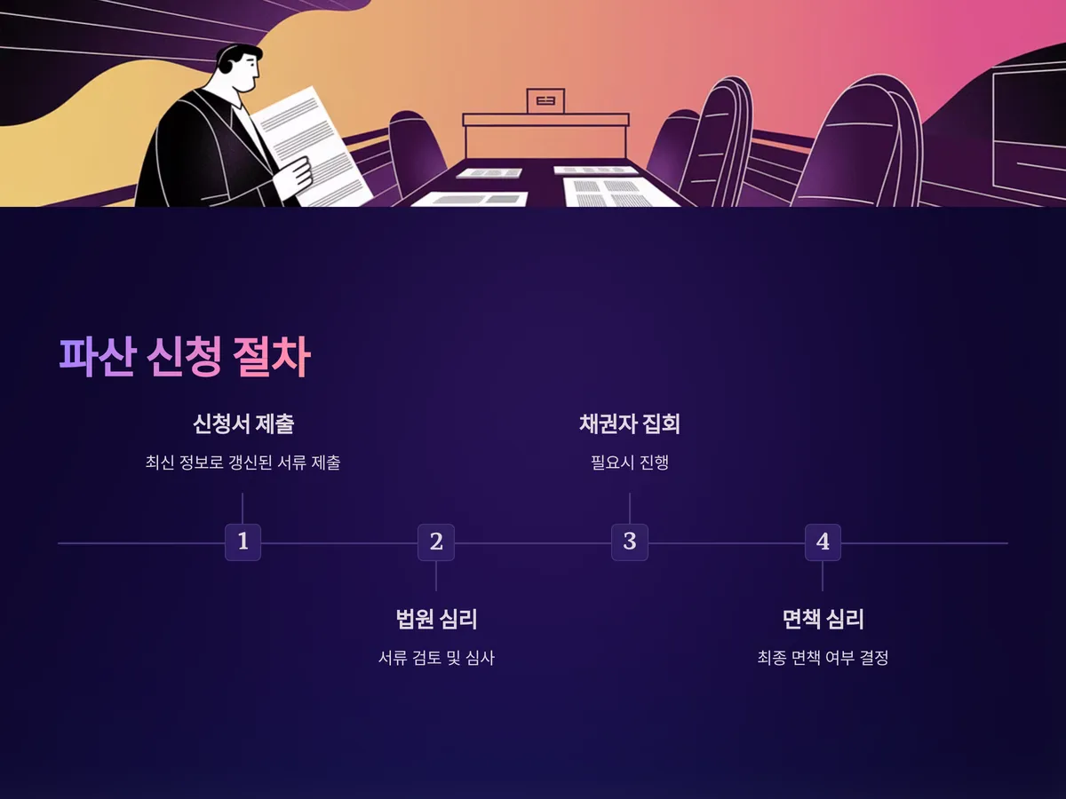 개인파산 절차는 일반적으로 다음과 같은 단계로 진행됩니다: 신청서 제출 → 법원의 심리 → 채권자 집회(필요시) → 면책 심리 → 면책결정. 개인회생보다는 비교적 간단한 절차이지만, 사전 준비는 철저해야 합니다.