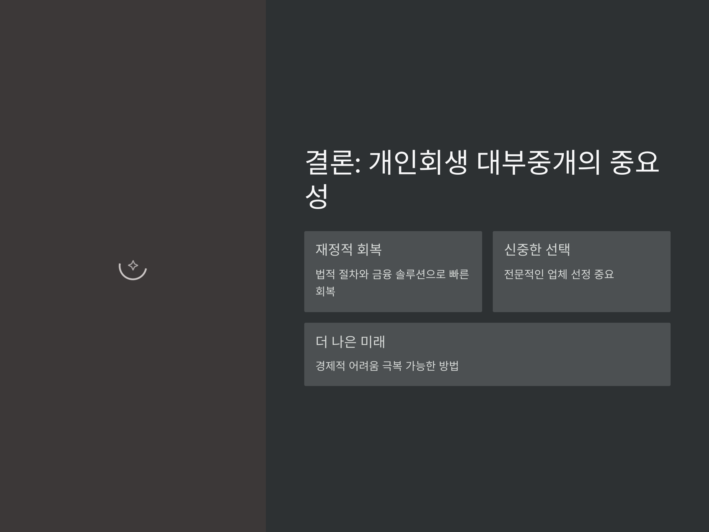 결국, 개인회생 대부중개 서비스는 부채 문제로 고통받고 있는 사람들에게 큰 도움이 될 수 있는 중요한 해결책입니다. 이를 통해 채무자는 법적 절차와 금융 솔루션을 통해 재정적 회복을 빠르게 이룰 수 있습니다. 하지만 대부중개 서비스를 선택할 때는 신중하게 업체를 선택하고, 전문적인 도움을 받는 것이 무엇보다 중요합니다. 이제는 경제적 어려움을 극복할 수 있는 방법이 많으므로, 개인회생 대부중개 서비스를 잘 활용하면 더 나은 재정적 미래를 만들어갈 수 있습니다.