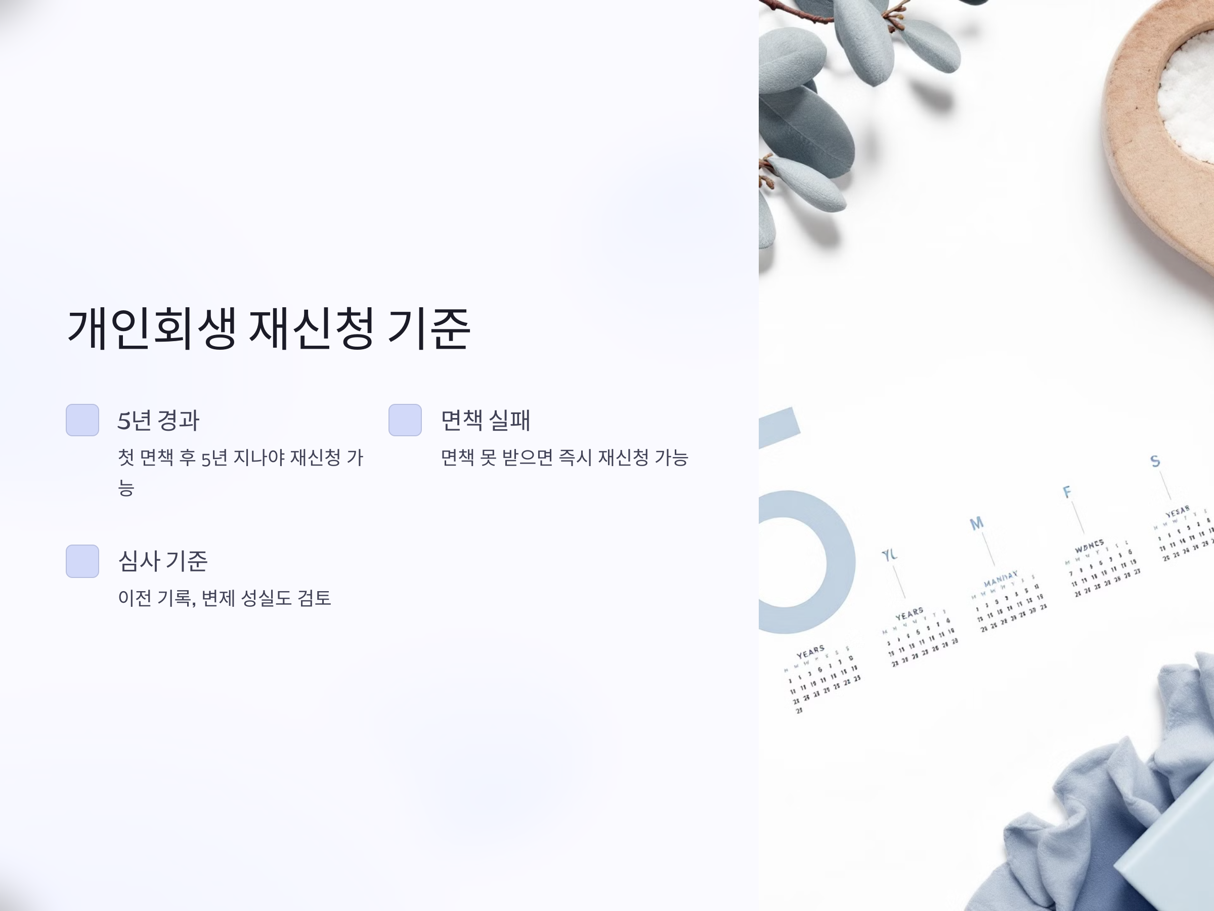 이는 개인회생 제도의 악용을 방지하기 위한 조치로, 법원은 이전 신청 기록과 변제 성실도를 검토하여 재신청 여부를 판단합니다.