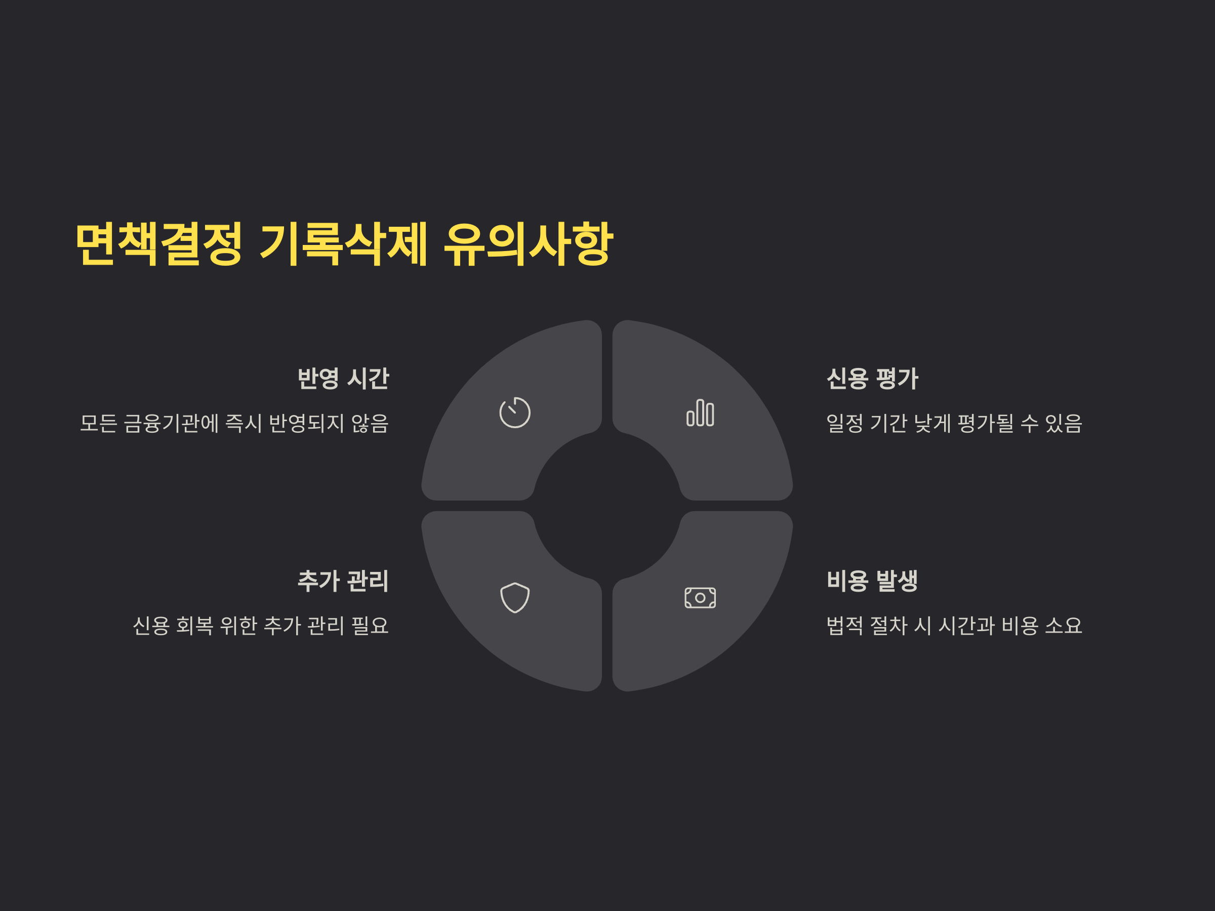 면책결정 기록을 삭제하려는 과정에서 유의해야 할 점은, 기록 삭제가 반드시 모든 금융기관에서 즉시 반영되는 것은 아니라는 점입니다. 일부 기관에서는 삭제된 기록을 반영하는 데 시간이 걸릴 수 있으며, 삭제 후에도 일정 기간 동안은 신용 평가가 낮게 평가될 수 있습니다. 따라서 면책결정 기록 삭제 후에도 신용 회복을 위한 추가적인 관리가 필요합니다. 또한, 법적 절차를 통해 삭제를 진행하는 경우 시간과 비용이 소요되므로 이에 대한 충분한 준비가 필요합니다.