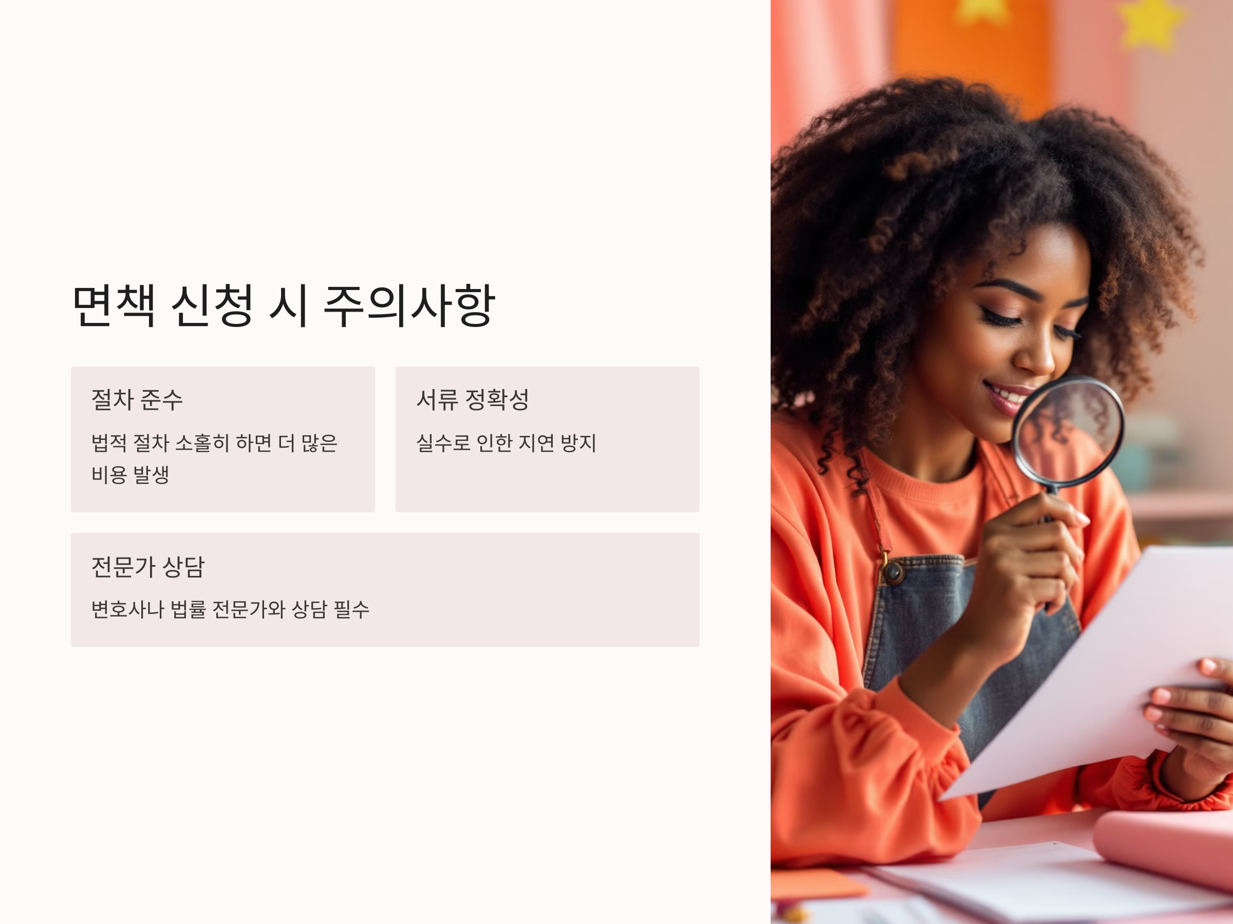 개인회생 면책 신청을 할 때 가장 중요한 것은 법적 절차를 제대로 이행하는 것입니다. 비용을 절감하려는 마음에 절차를 소홀히 할 경우, 예상보다 더 많은 비용이 발생할 수 있습니다. 또한, 서류 준비나 법원 제출 과정에서 실수가 발생하면, 면책 신청이 지연될 수 있으며 추가 비용이 발생할 수 있습니다.