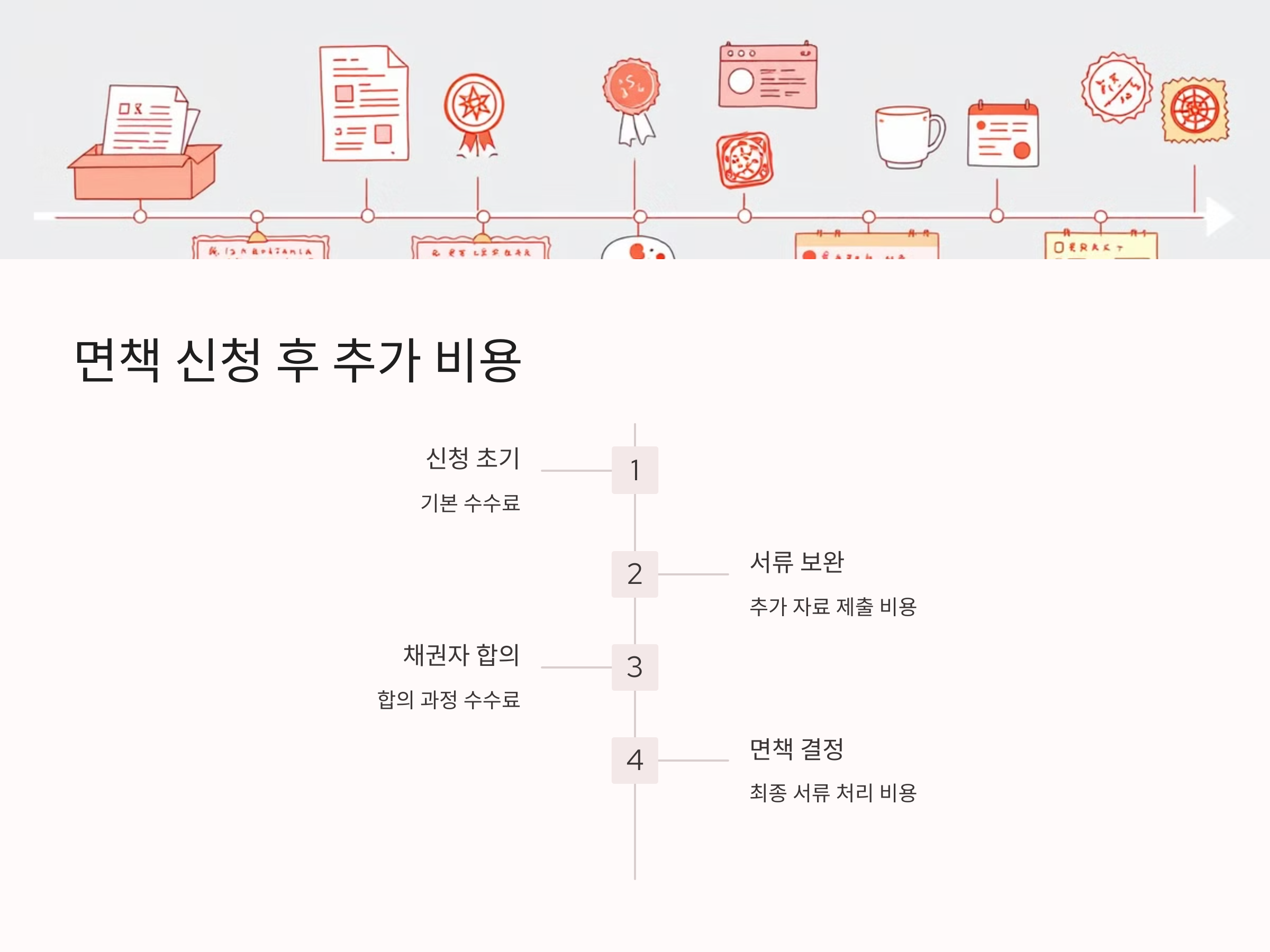 면책 신청 후 발생할 수 있는 추가 비용은 추가 서류 제출 비용이나 채권자와의 합의 수수료 등이 있습니다.