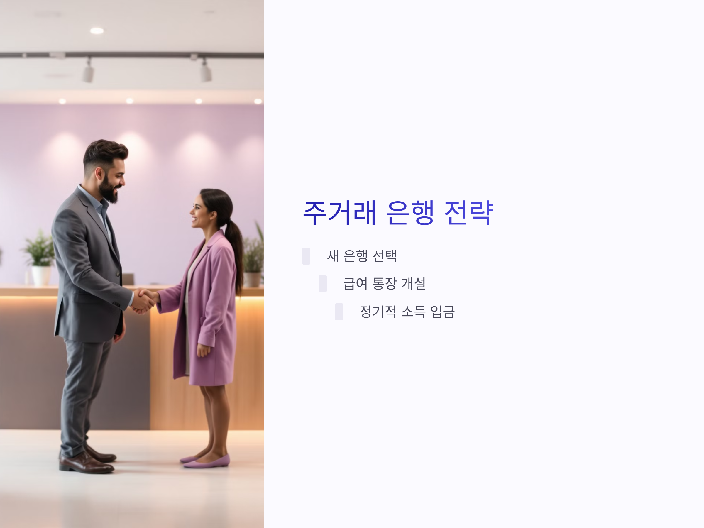 면책 후 새로운 금융 거래를 시작할 때, 이전에 채무가 없었던 은행을 주거래 은행으로 선택하는 것이 좋습니다. 해당 은행에 급여 통장을 개설하고 정기적인 소득을 입금하면 신용점수 회복에 도움이 됩니다. 안정적인 소득 입금은 금융기관으로부터 긍정적인 평가를 받을 수 있습니다.