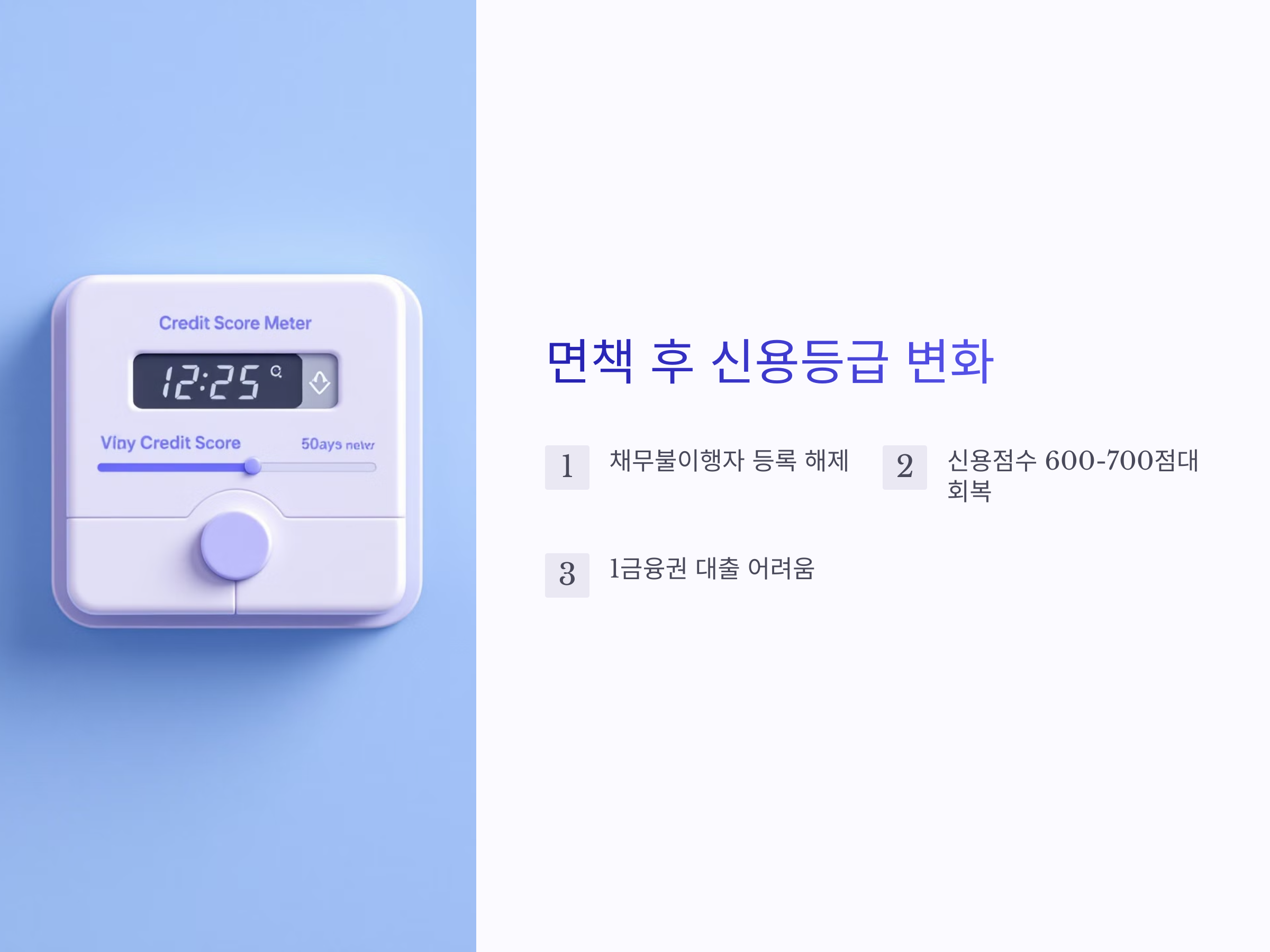 개인회생 면책을 받으면 법원은 이를 한국신용정보원에 통보하여 채무불이행자 등록이 해제됩니다. 그러나 개인회생 기록은 공공기록으로서 일정 기간 동안 남게 되며, 이로 인해 신용등급이 낮아질 수 있습니다. 일반적으로 면책 후 신용점수는 600점대 후반에서 700점대 초반으로 회복되며, 이는 과거 신용등급 기준으로 6등급에 해당합니다. 이 정도의 신용등급으로는 1금융권 대출이 어려울 수 있으므로, 신용회복을 위한 적극적인 노력이 필요합니다.