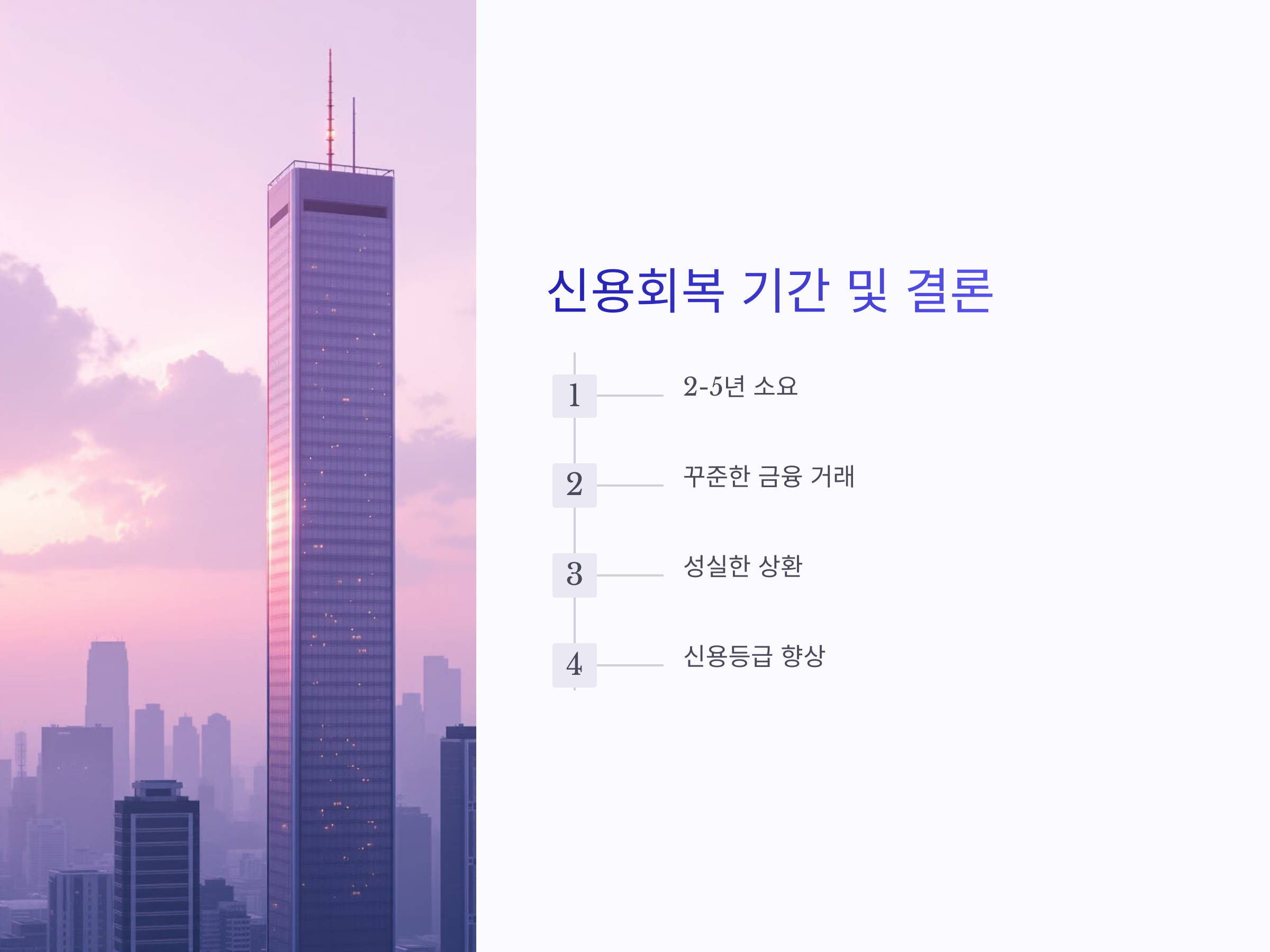 개인회생 면책 후 신용등급이 완전히 회복되기까지는 개인의 금융 활동과 관리에 따라 다르지만, 일반적으로 2~5년이 소요됩니다. 꾸준한 금융 거래와 성실한 상환을 통해 신용등급을 점진적으로 향상시킬 수 있으며, 이를 통해 향후 금융 거래에서 더 나은 조건을 얻을 수 있습니다.