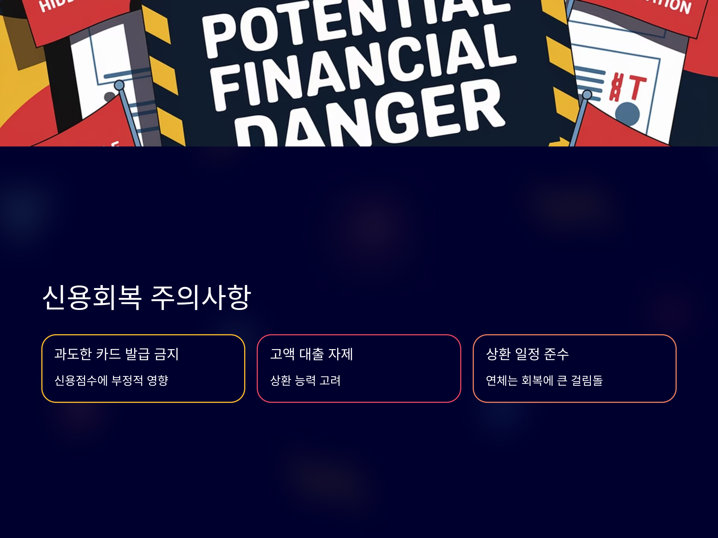 신용점수를 회복하려면 인내심과 꾸준한 노력이 필요합니다. 신용카드를 급격히 많이 발급받거나 고액의 대출을 신청하는 것은 신용점수에 부정적인 영향을 미칠 수 있습니다. 또한, 신용회복을 위한 대출을 너무 많이 신청하거나, 상환을 놓치는 경우 점수 회복에 오히려 더 큰 걸림돌이 될 수 있습니다.