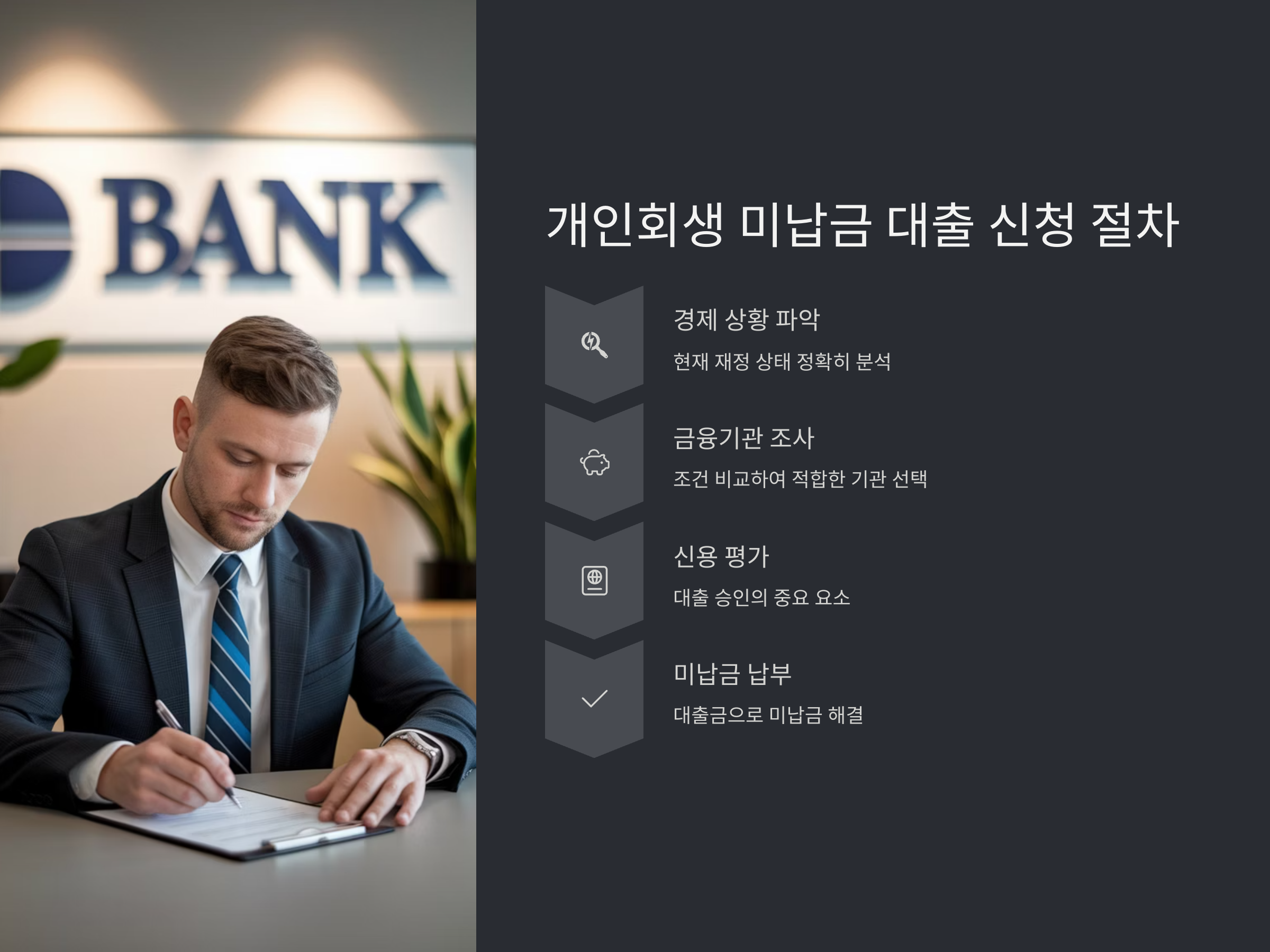 개인회생 미납금 대출을 신청하려면 몇 가지 절차를 거쳐야 합니다. 첫 번째로, 현재 자신의 경제적인 상황을 정확하게 파악해야 합니다. 이를 바탕으로 대출을 받을 수 있는 금액이나 이자율을 계산할 수 있기 때문입니다. 그런 다음, 대출 가능한 금융기관을 찾아야 합니다.