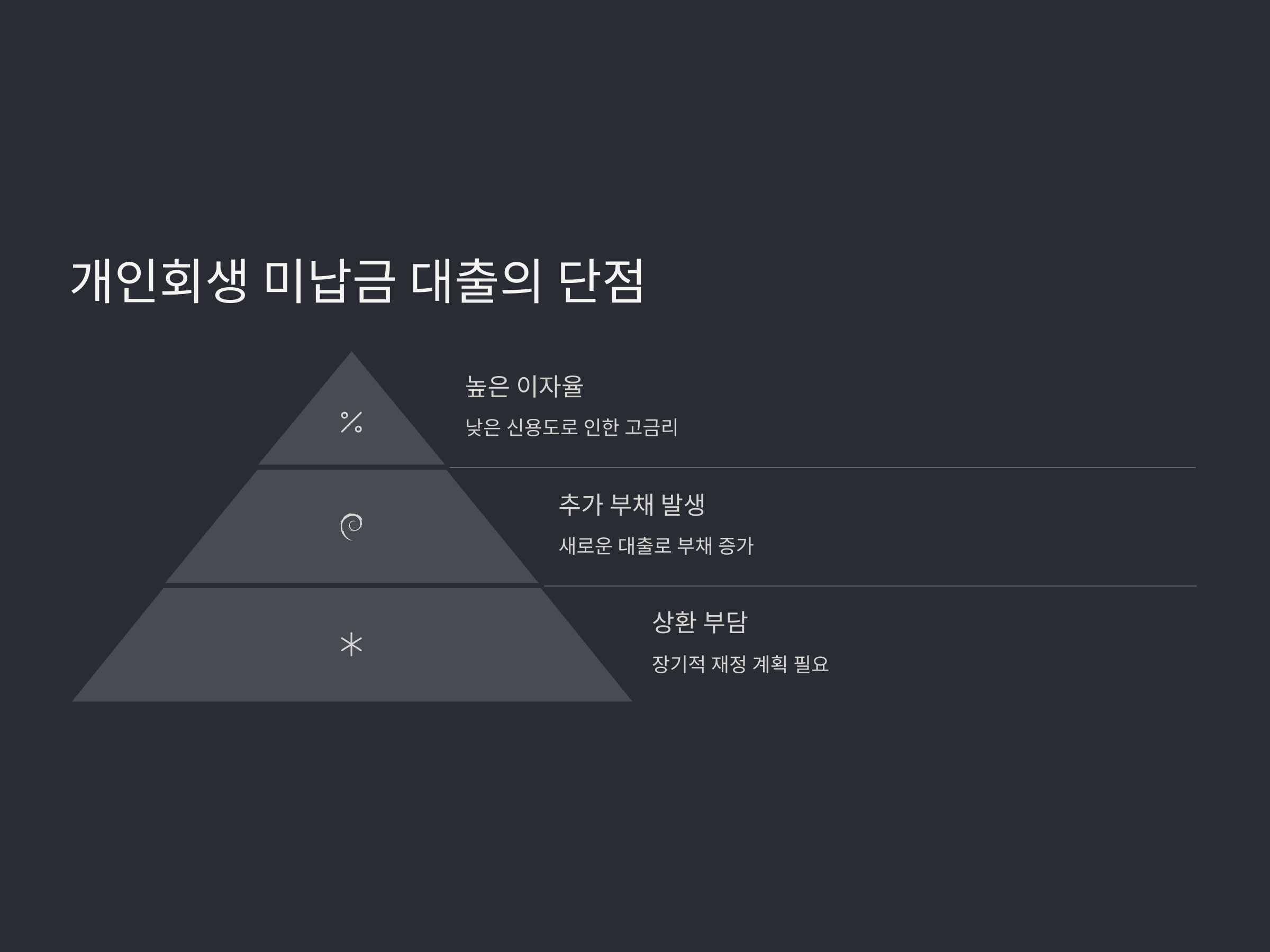 하지만 단점도 존재합니다. 첫 번째로, 대출 이자율이 높을 수 있다는 점입니다. 특히 개인회생을 신청한 사람들의 경우, 신용도가 낮을 수 있기 때문에 대출 이자율이 높게 책정될 가능성이 있습니다. 또한, 대출을 받는 것이기 때문에 추가적인 부채가 발생하는 문제도 고려해야 합니다.