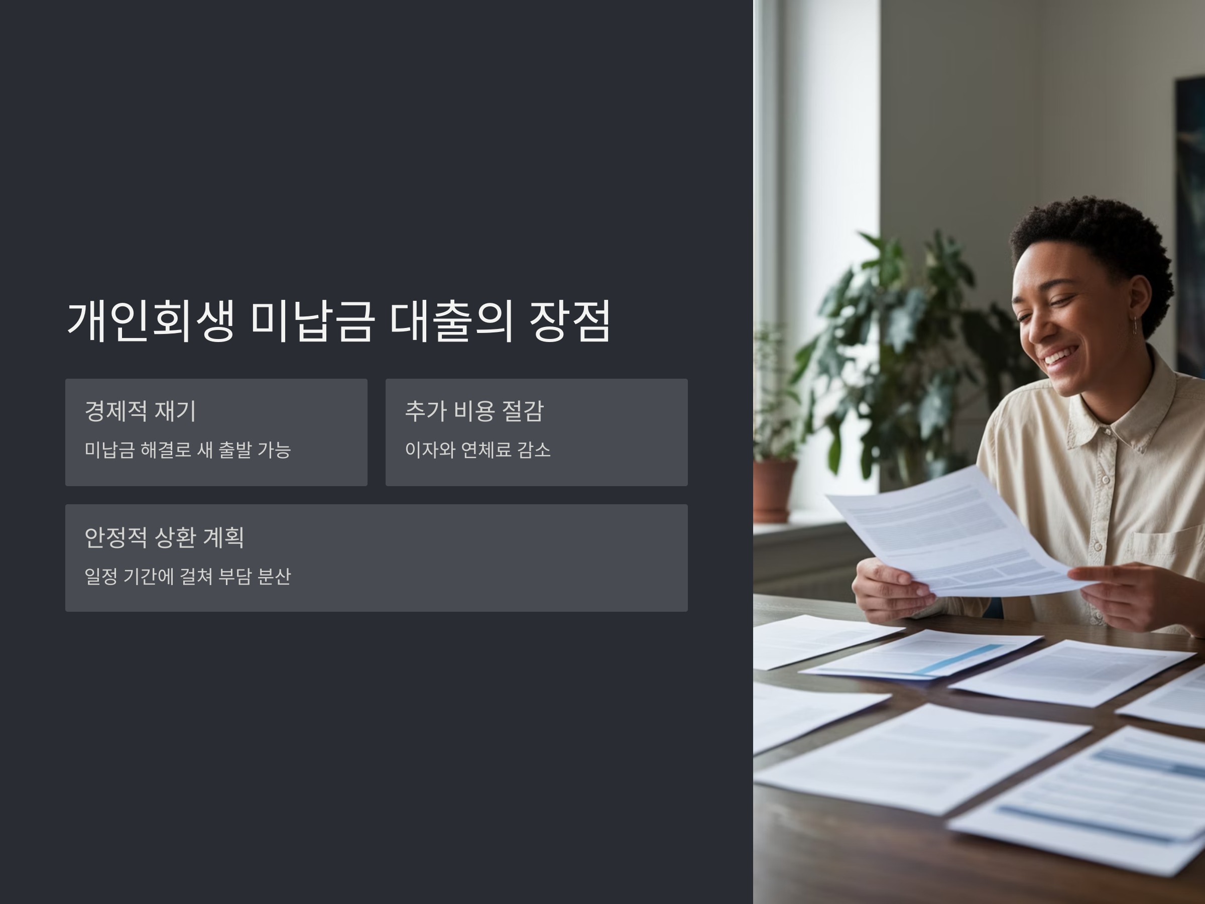 개인회생 미납금 대출의 가장 큰 장점은 미납금을 해결하면서 경제적인 재기를 도울 수 있다는 점입니다. 대출을 통해 미납금을 한 번에 해결하면, 추가적인 이자나 연체료를 줄일 수 있습니다. 또한, 이러한 대출은 대출 상환을 일정 기간에 걸쳐 할 수 있기 때문에, 한 번에 큰 부담을 느끼지 않고 안정적인 상환 계획을 세울 수 있습니다.