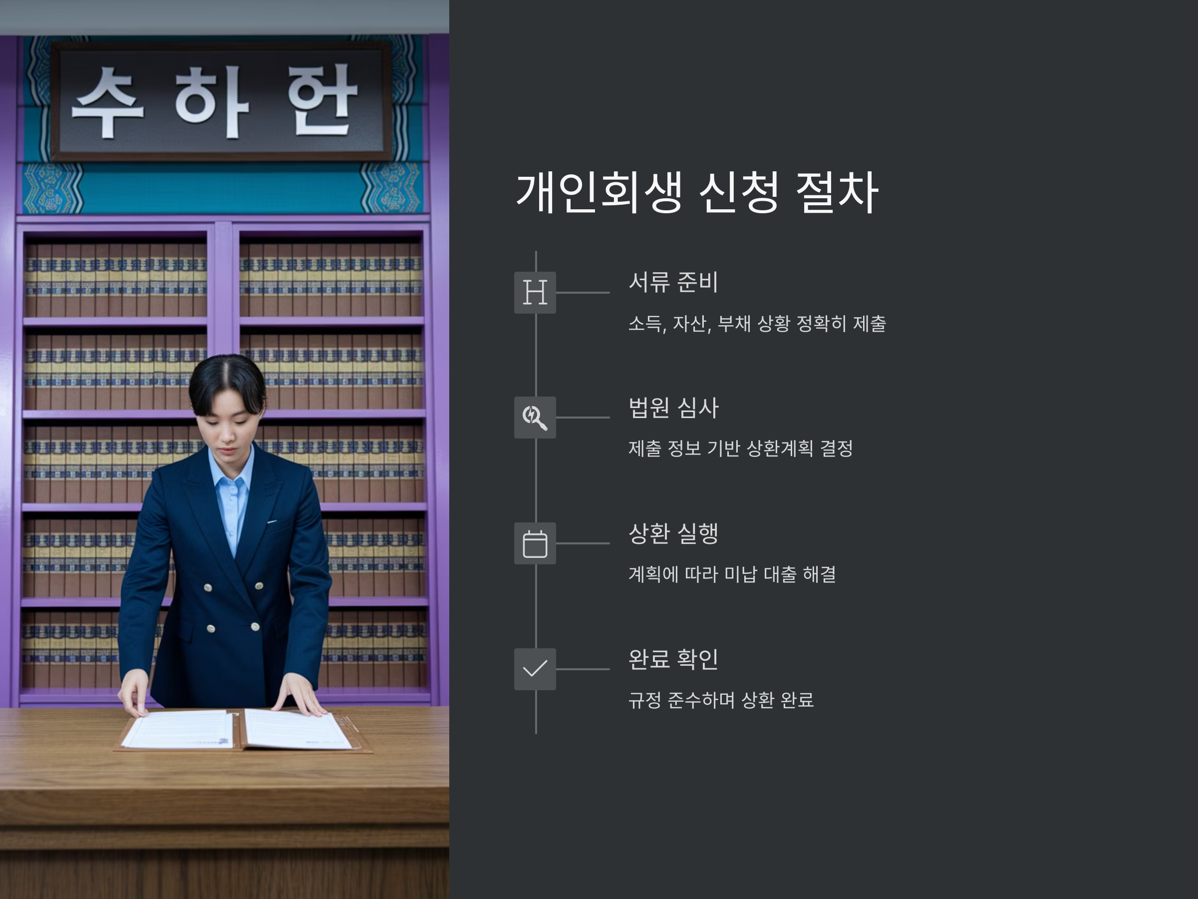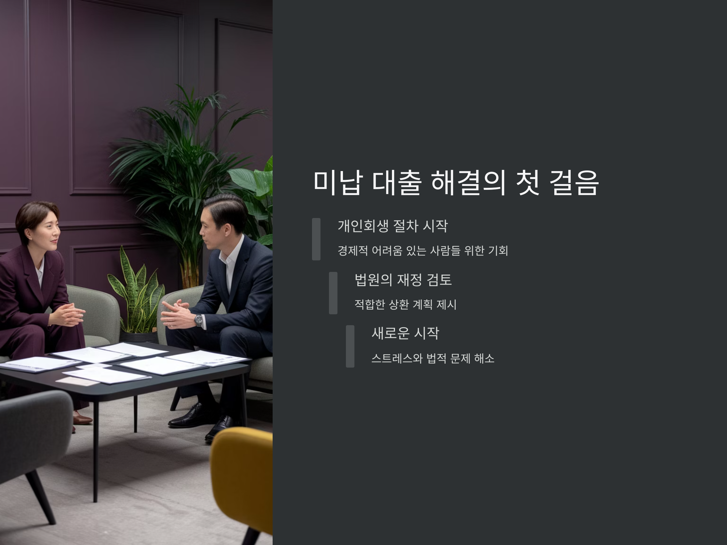 미납 대출을 해결하기 위한 첫 걸음은 바로 개인회생 절차를 밟는 것입니다. 개인회생 절차는 경제적으로 어려운 사람들에게 채무를 줄이거나 조정할 수 있는 기회를 제공합니다. 만약 대출 상환이 어려운 상황이라면, 개인회생을 통해 미납 대출에 대한 상환 기간을 연장하거나 일부 탕감을 받을 수 있습니다.
