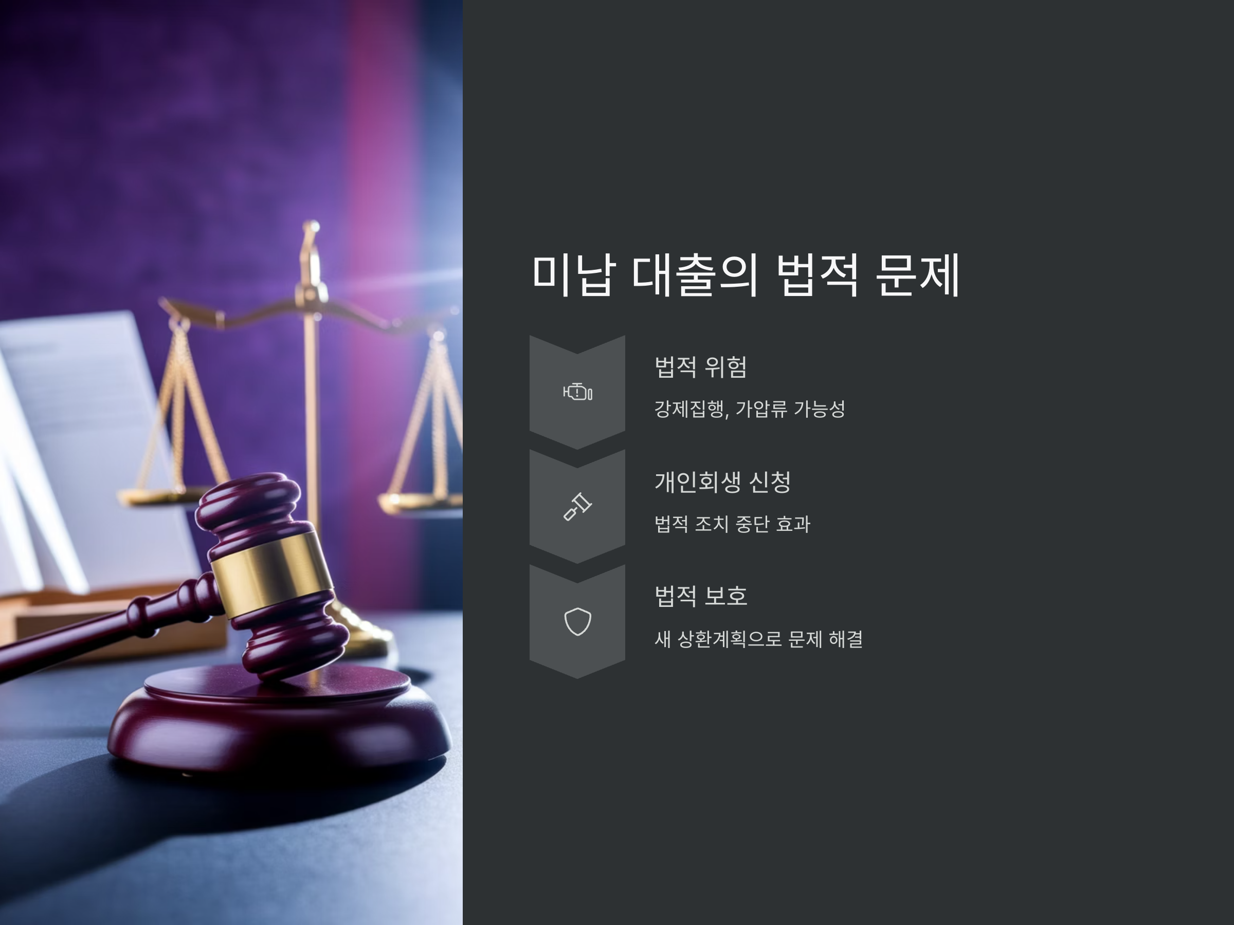 미납 대출은 단순한 재정 문제뿐만 아니라, 법적인 문제로도 발전할 수 있습니다. 대출을 갚지 않으면 채권자들이 법적 조치를 취할 수 있으며, 이로 인해 강제집행이나 가압류가 발생할 수 있습니다. 하지만, 개인회생을 통해 법적인 조치를 예방하고, 채권자와의 협상을 통해 해결할 수 있는 방법이 존재합니다.
